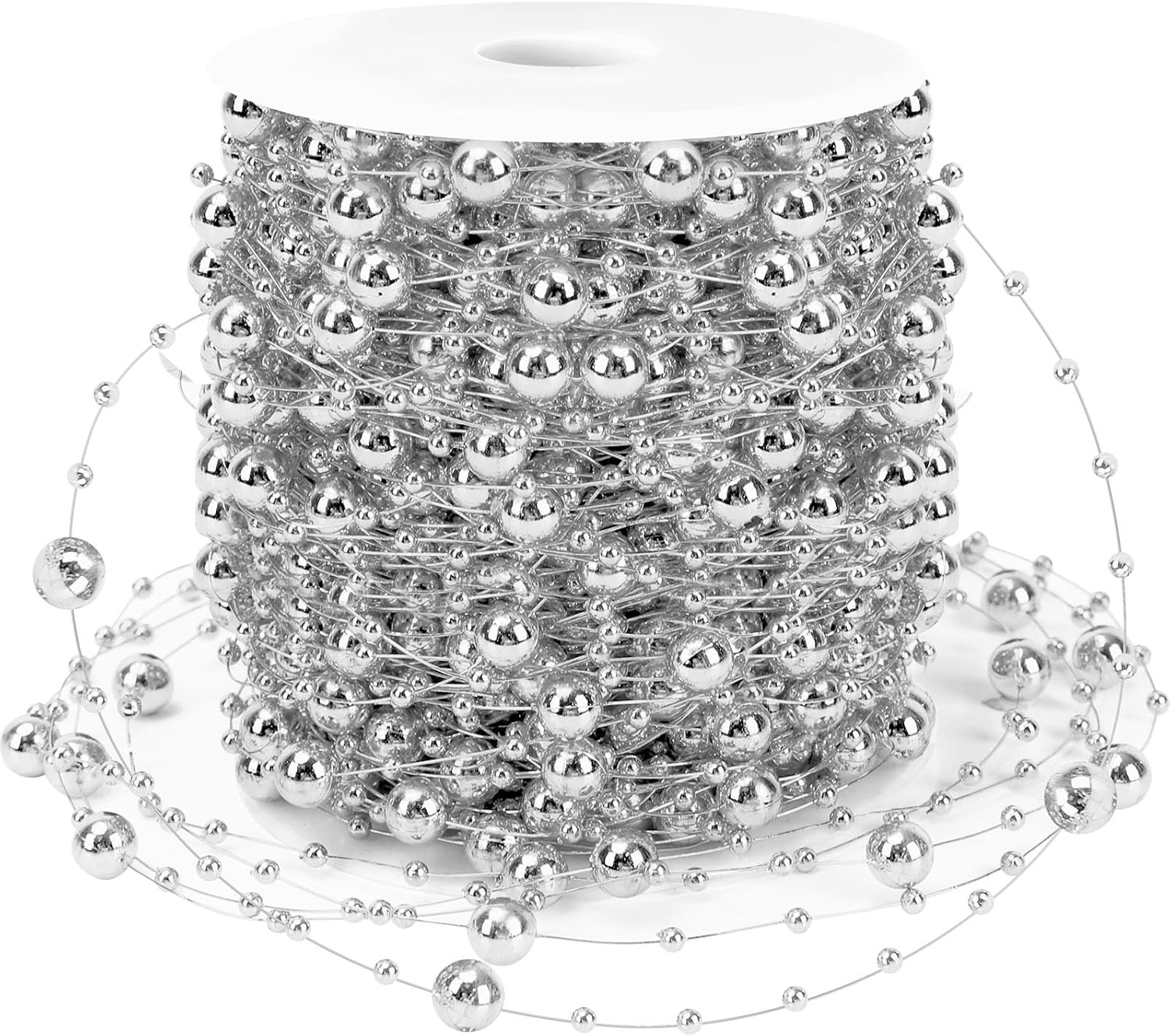 JULBEAR Beads Garland Decoration, 1Rolls 131Feet Silver Christmas Pearl Strands Chain Bead Garland for Christmas Tree Fireplace Wreath Gift Bouquet Crafts Wrapping Party Centerpieces Decoration