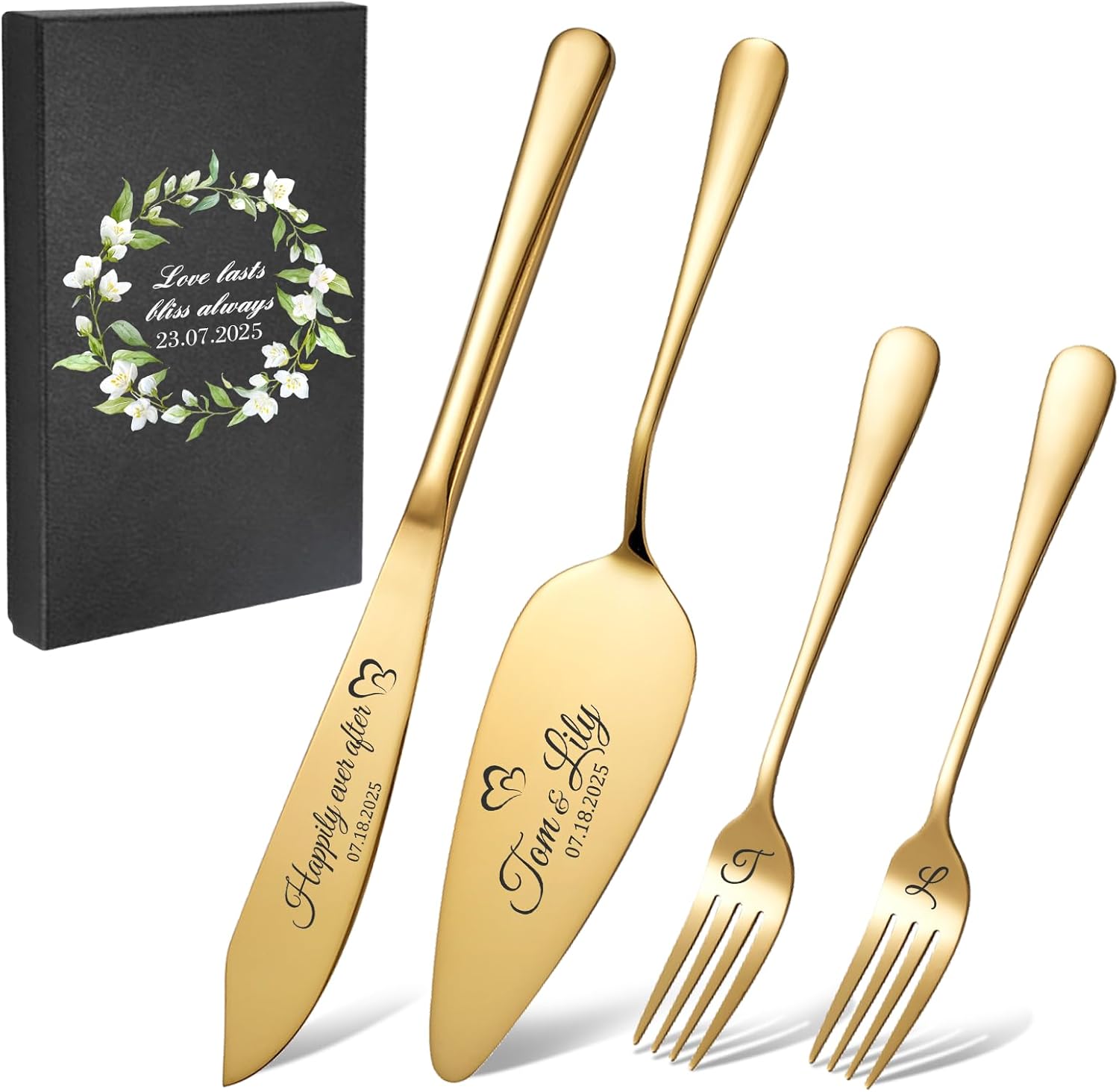 Personalized 4 Piece Wedding Cake Cutting Set, Custom Names Cake Knife and Server set with Forks, Anniversary Birthday Bridal Wedding Registry Gifts (Gold)