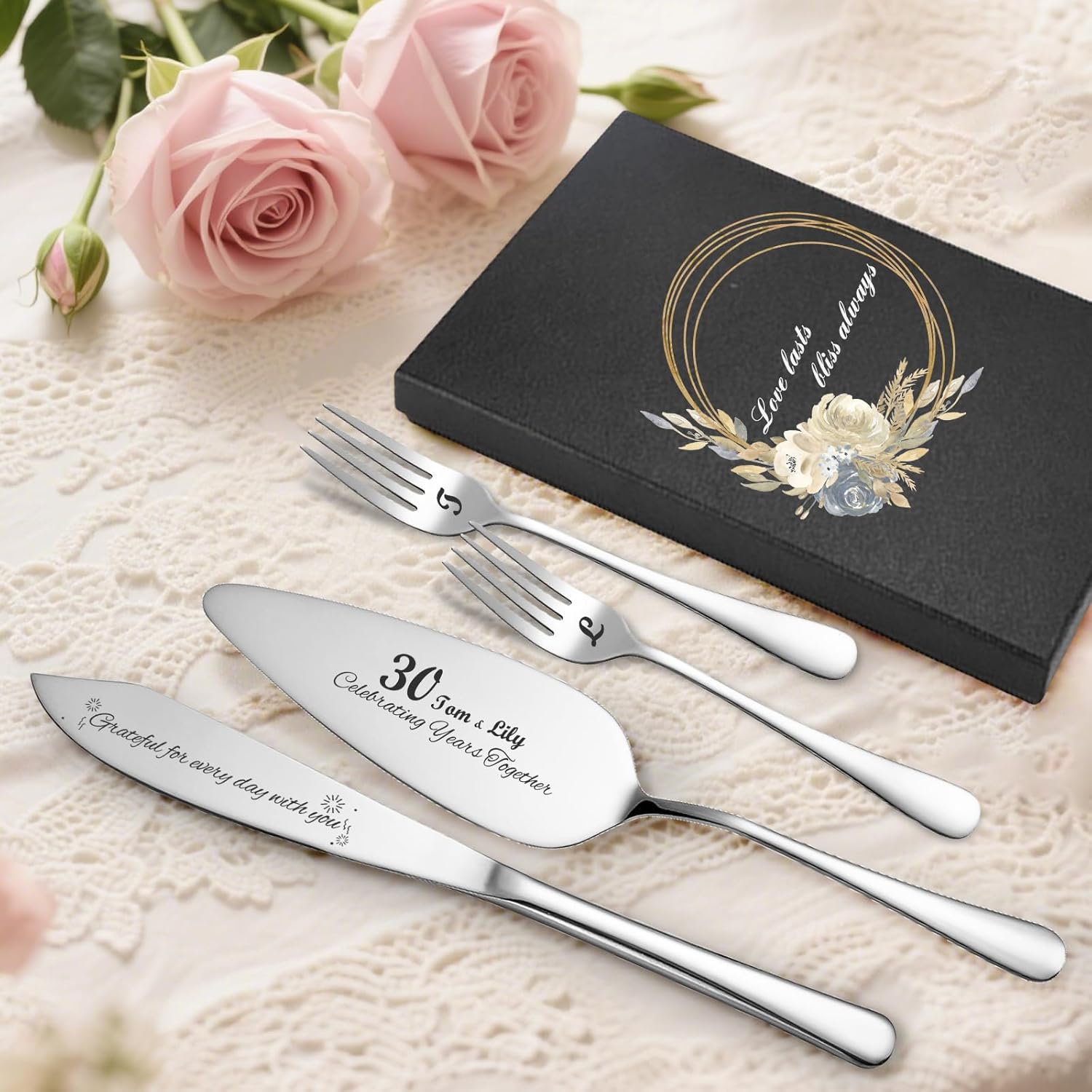 Personalized 4 Piece Wedding Cake Cutting Set, Custom Names Cake Knife and Server set with Forks, Anniversary Birthday Bridal Wedding Registry Gifts (Silver)