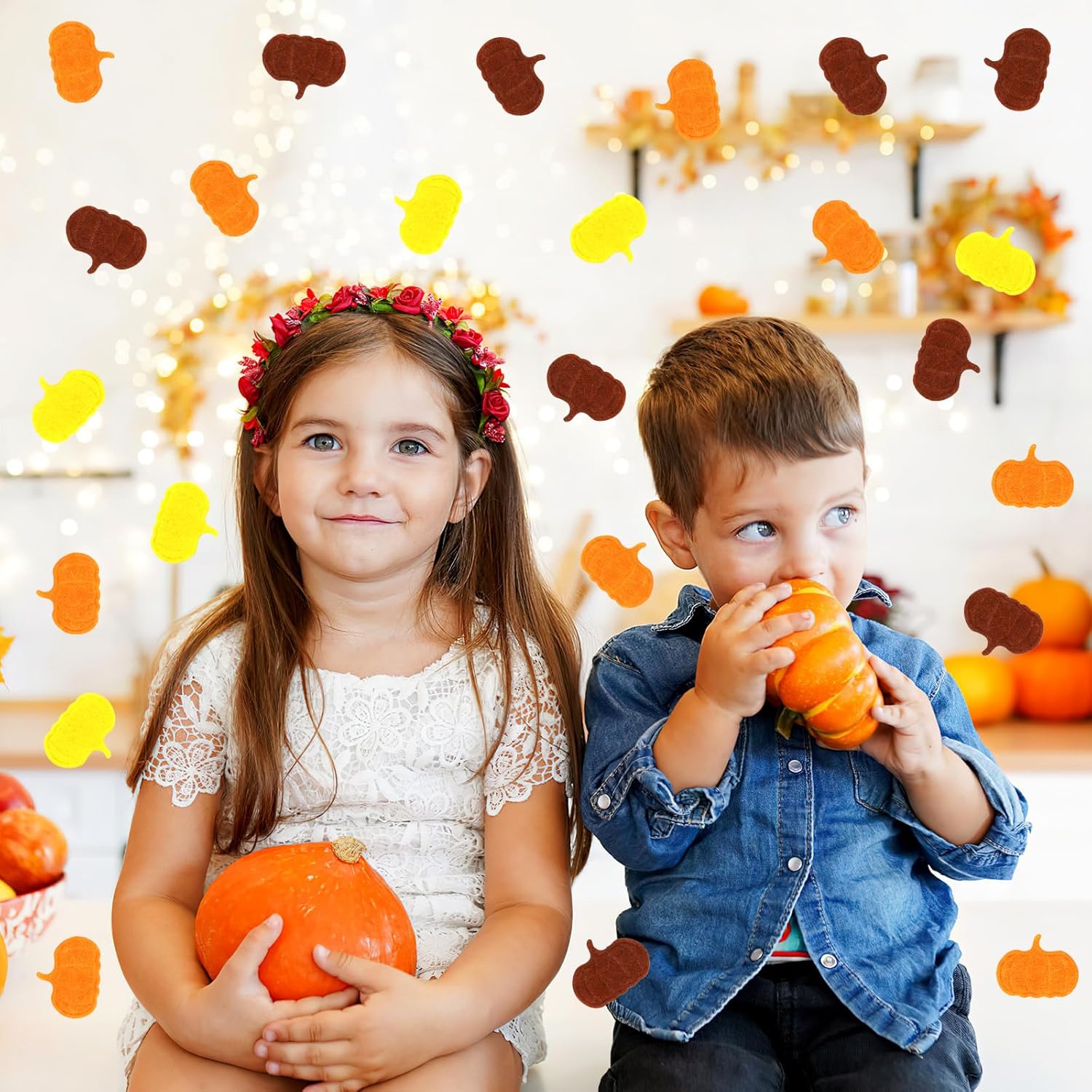 • Fall-Themed Design: These charming pumpkin confetti features classic autumn colorsβ€”deep brown, light brown, orange, and yellowβ€”capturing the essence of the autumn. The festive colors blend seamlessly with Thanksgiving setups, adding warmth and joy to your celebrations