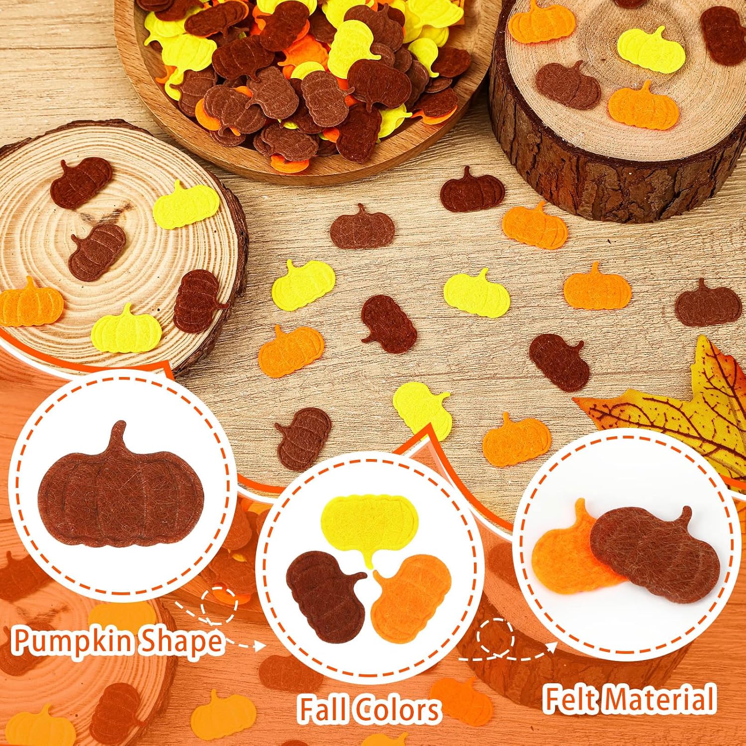 • Premium Felt Material: Our autumn confetti is crafted from soft, reliable felt fabric, offering a cozy touch and long-lasting vibrancy. The Thanksgiving confetti can withstand wear and fade, these fall confetti for table maintain intact form and vivid colors, making the pumpkin confetti ideal for repeated seasonal use