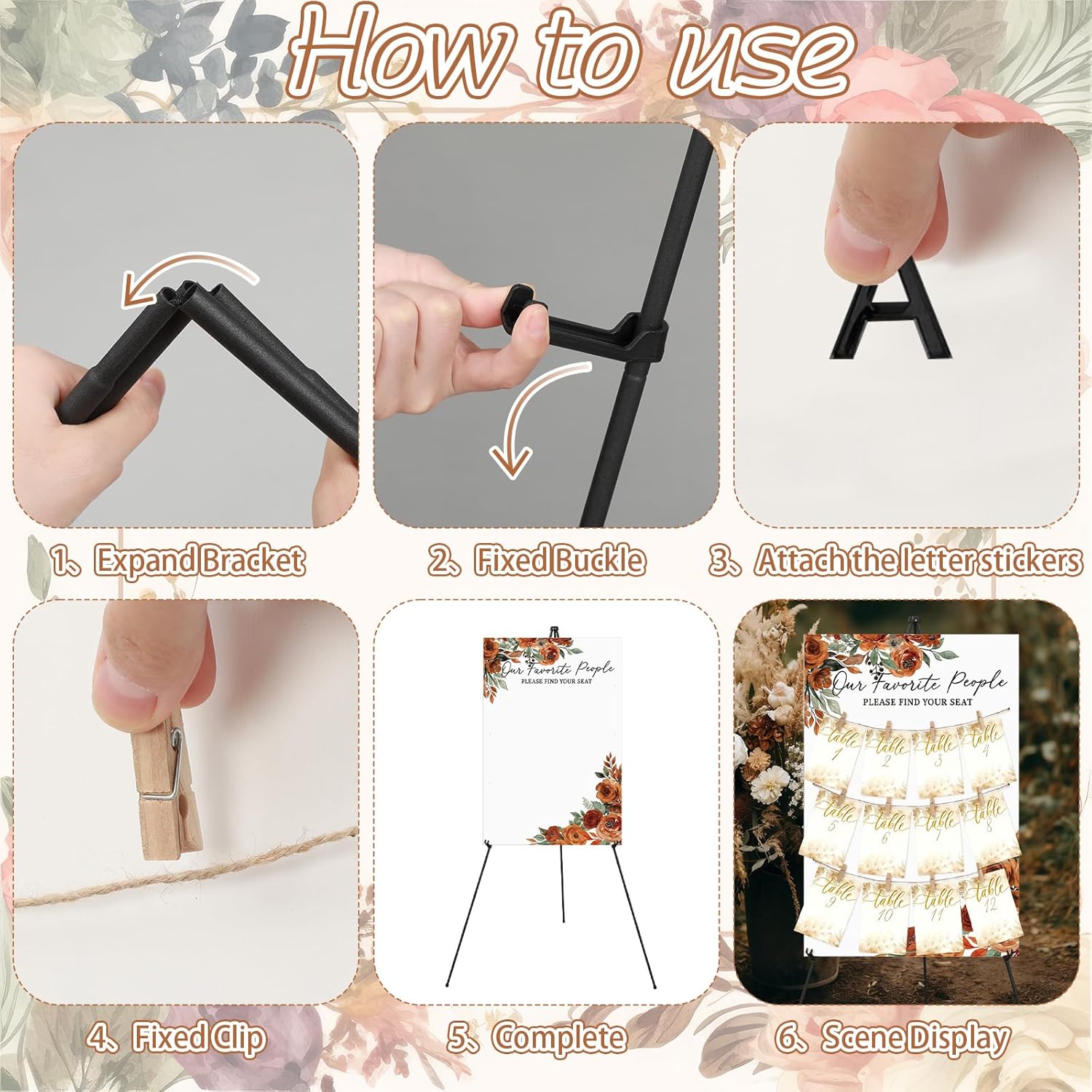 • Multi Purpose Scene Application: in addition to weddings, the rustic wedding seating chart board is suitable for birthday parties, baby showers, anniversaries, commercial exhibitions and other occasions; The easel can be applied as a poster stand, and the seating chart can be replaced with a photo wall or menu; It is a multi-purpose item with high cost performance