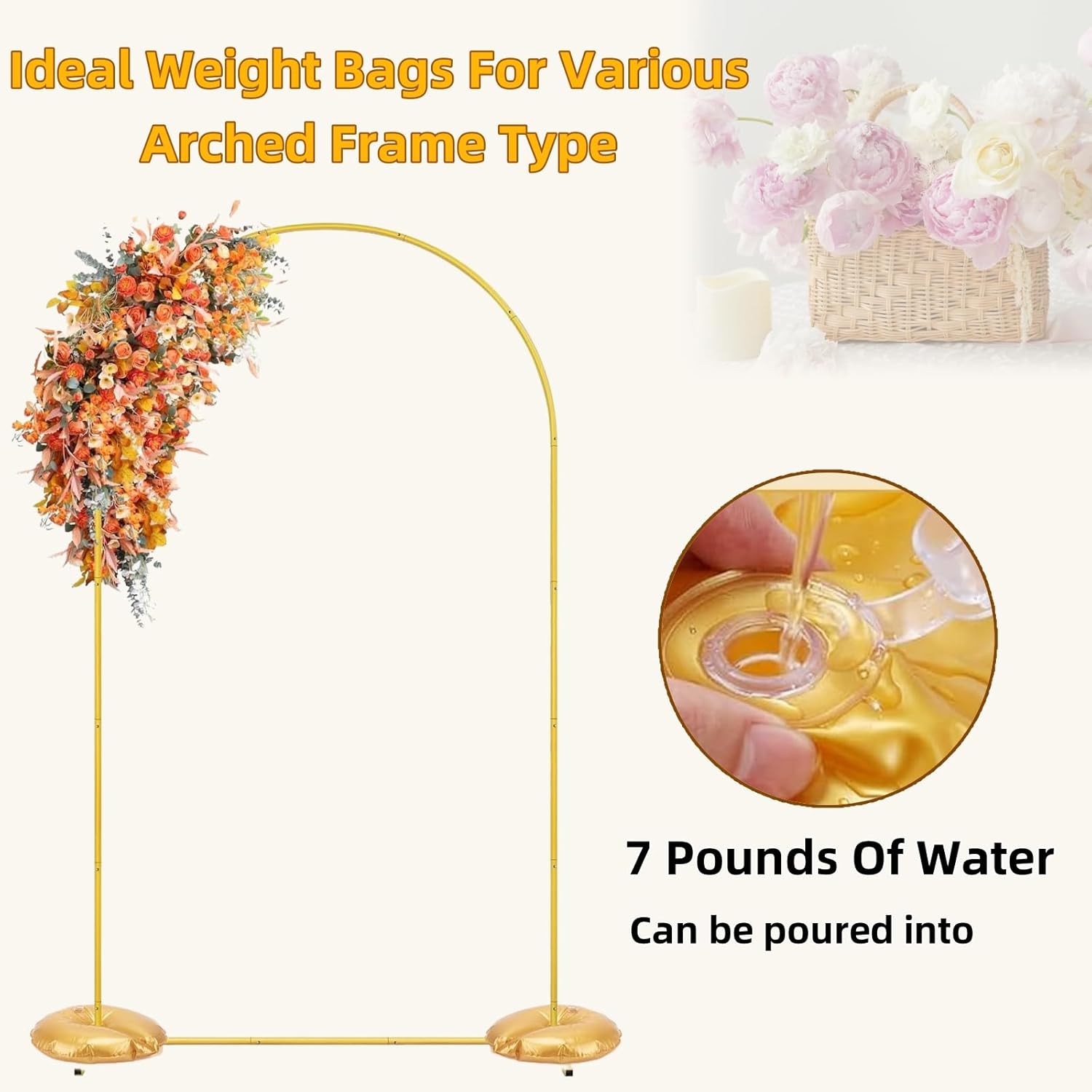 • ✅【10 Pack Gold Water Weight Bags for Arch Stand Base】 Includes 10 heavy-duty gold water bags, ideal for balloon arch stands, backdrop frames, or party sign holders. Designed to improve overall stability and prevent tipping during indoor or outdoor events.