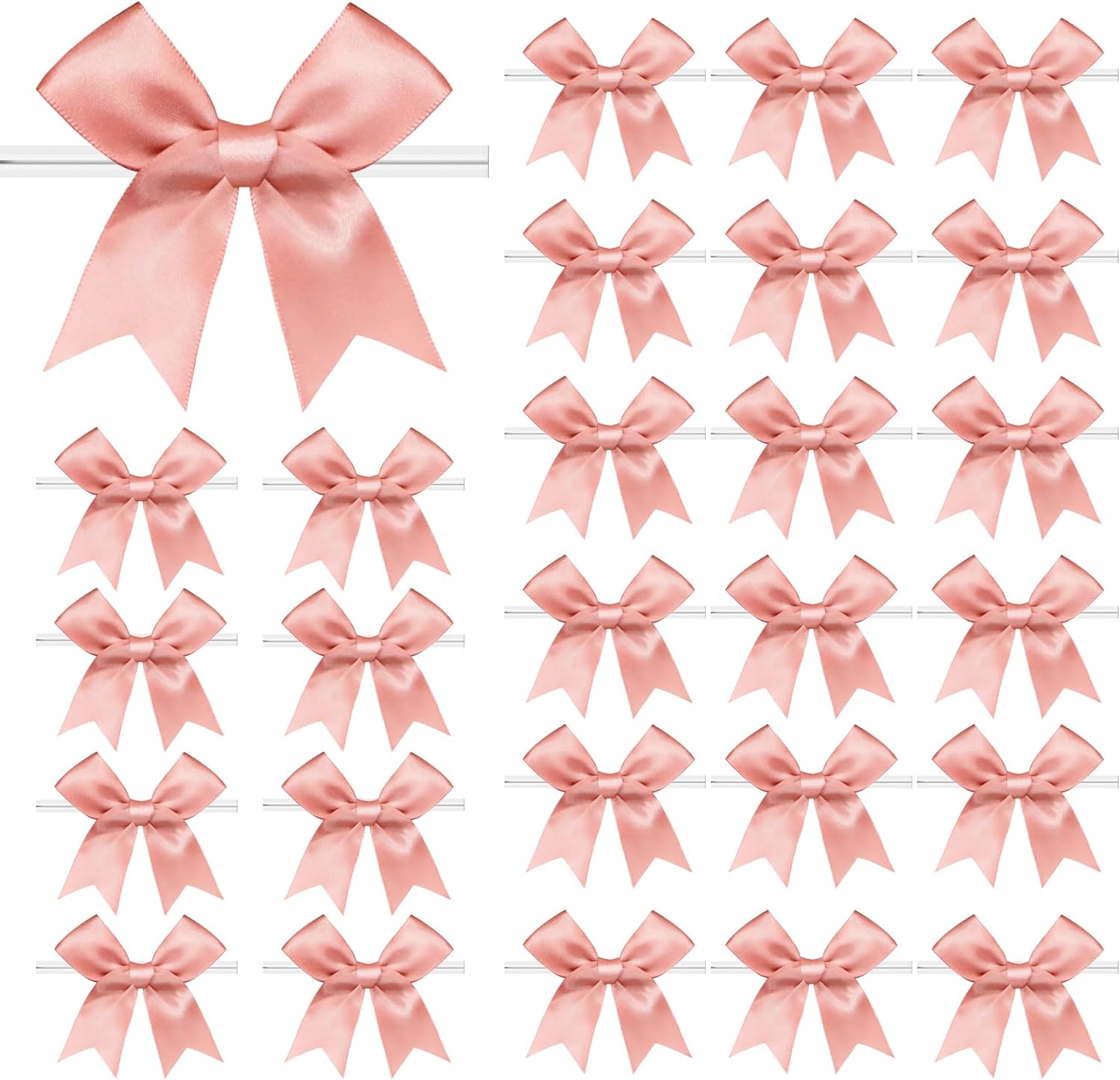 50 PCS Twist Tie Bows Satin Ribbon Bows 3.3 Inch Gift Wrap Bows Craft Bows for Gift Wrapping, Party Decorations Gifts Bag DIY Treat Bags Wedding Decor Baby Shower Christmas (Rose Pink)