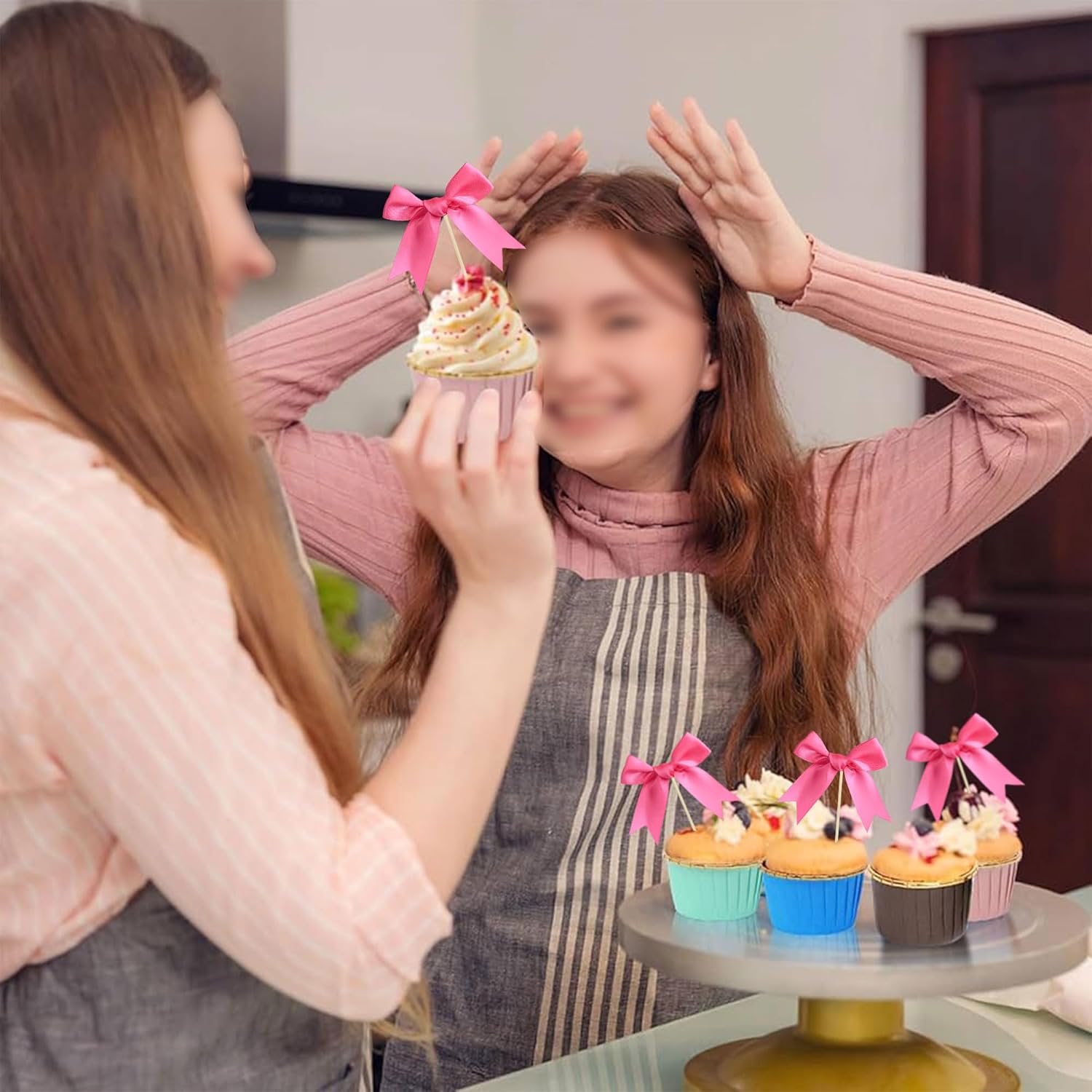 Gyufise 24Pcs Bow Cupcake Toppers Coquette Bow Girls Birthday Cake Decorations Bowknot Cake Toppers Bowknot Cupcake Picks for Baby Shower Birthday Wedding Bridal Engagement Party Supplies Rose Red