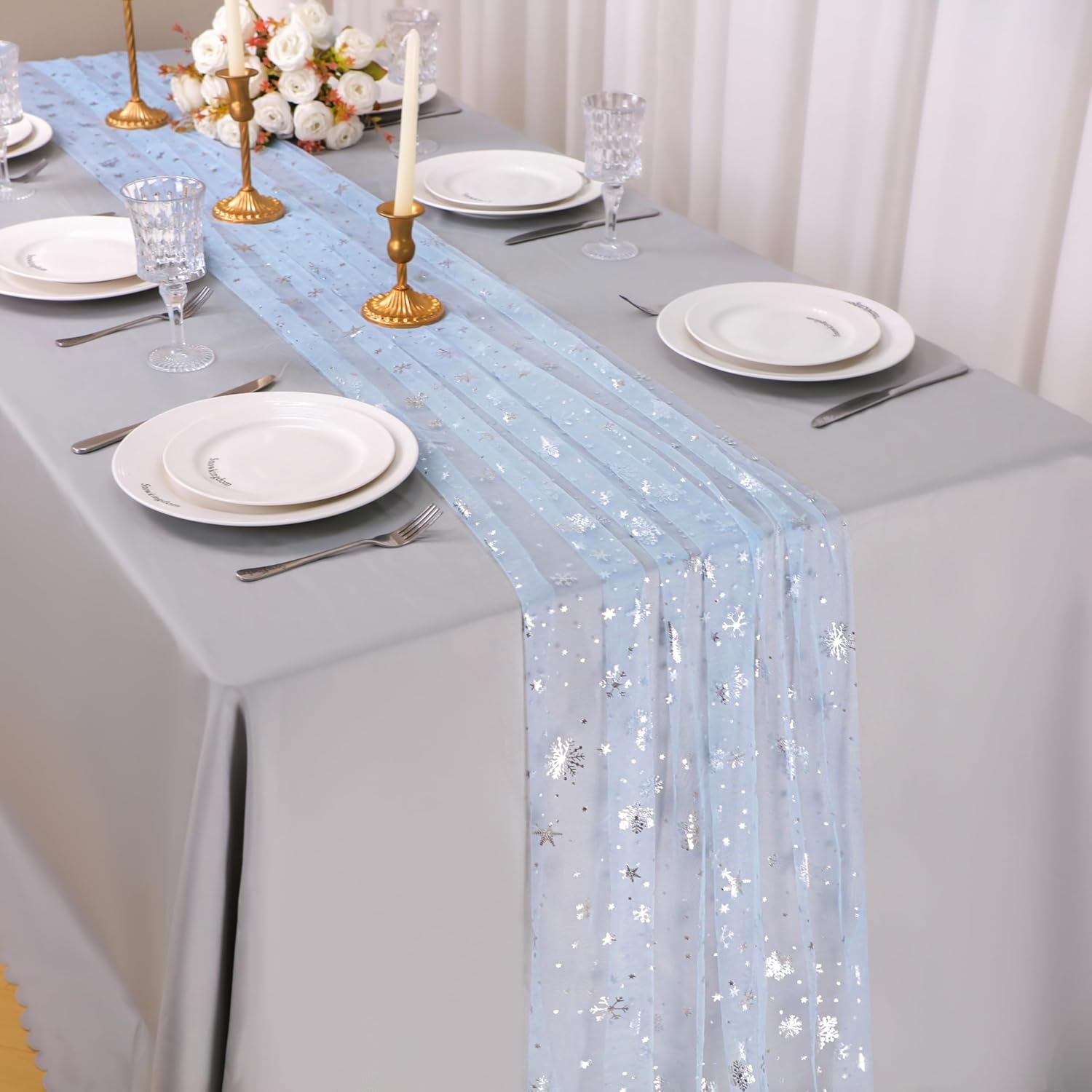 Snowkingdom Silver Snowflake Christmas Table Runner, 10ft Blue Cheesecloth Gauze Sheer Chiffon 120 Inch Winter Table Runner, Seasonal Holiday Kitchen Dining Decoration for New Year Outdoor Party Decor