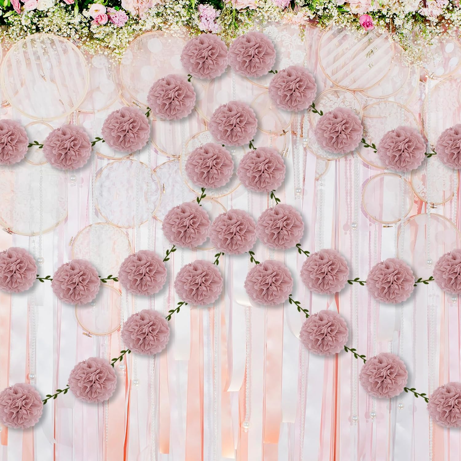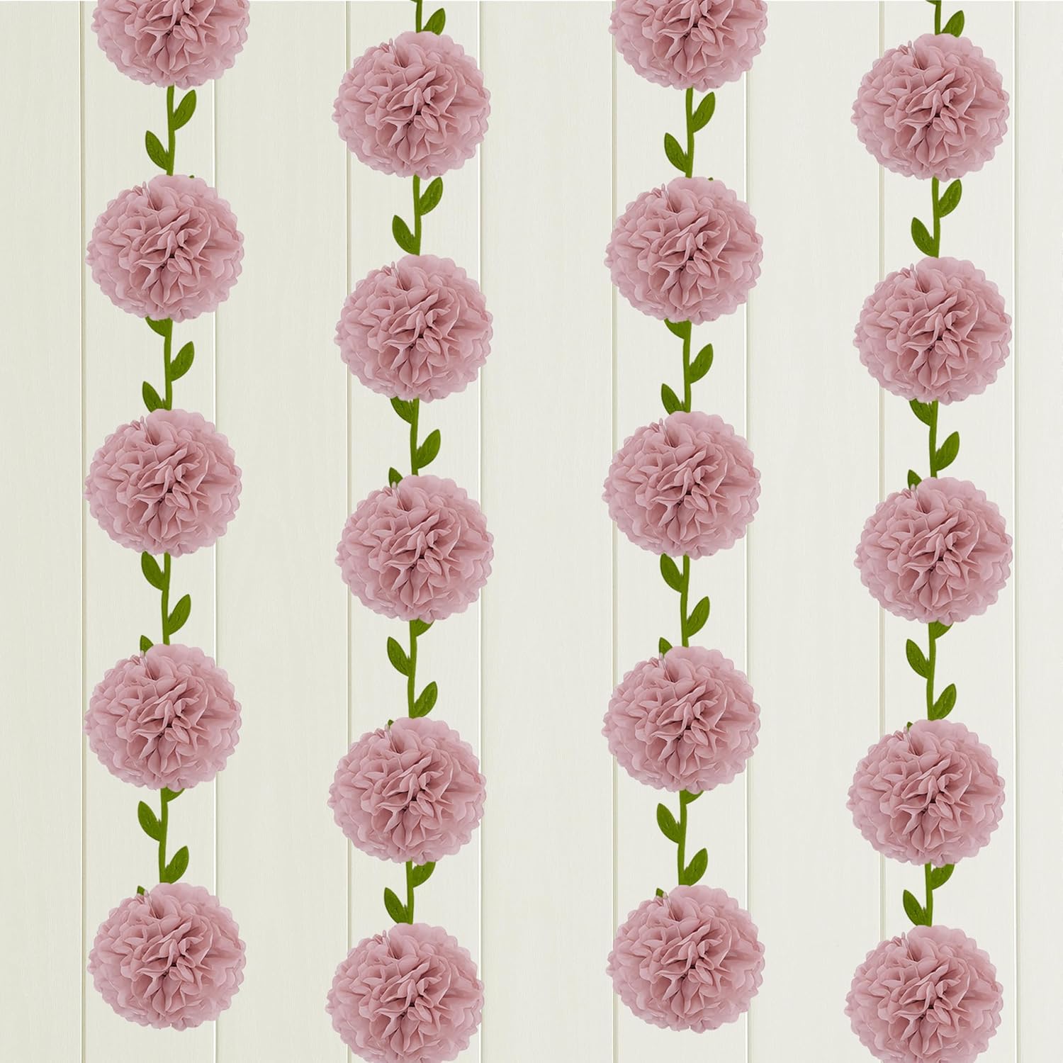 • [Packaging includes] 12x pre-strung 6 inches Rose pink soft tissue paper pompoms, 2x 6.6FT Vine garland banner
