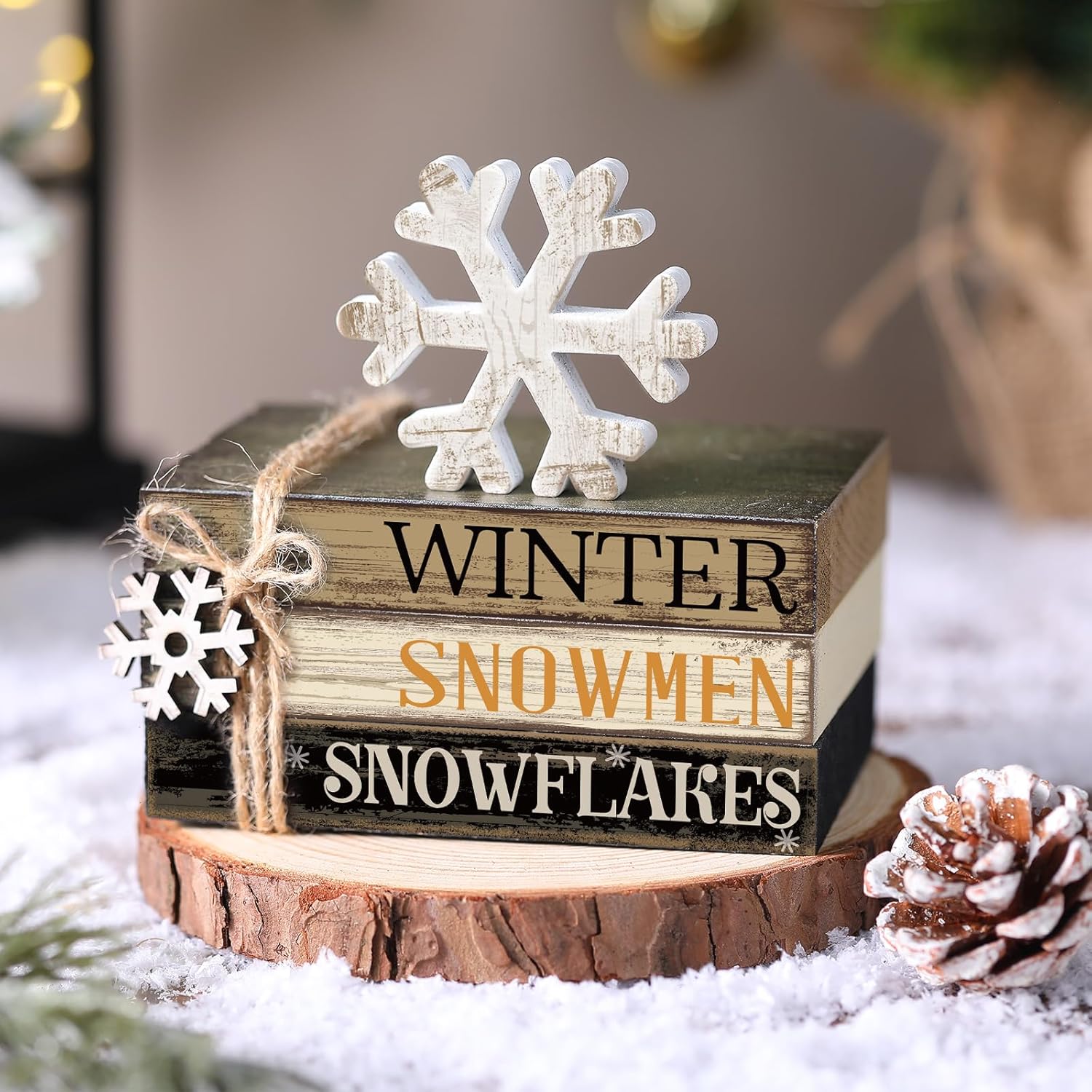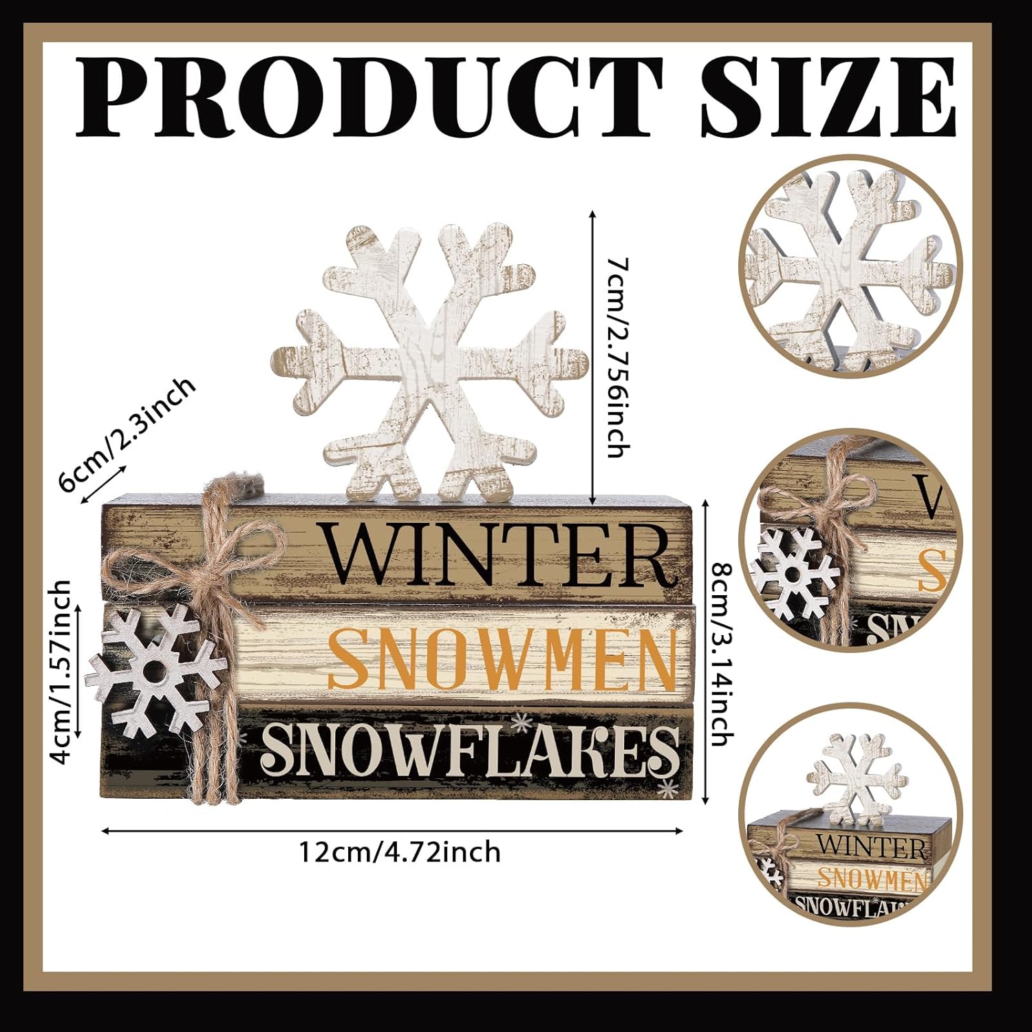 4 Pcs Winter Table Decorations Snowmmen Tiered Tray Decorations Christmas Mini Snowflake Wooden Books Signs for Office Shelf Classroom Tabletop Bookshelf