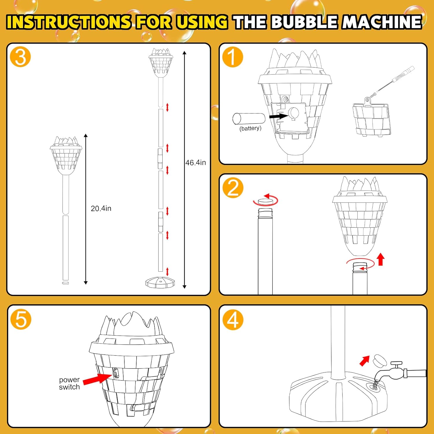 • Easy Assembly & Portable: Our bubble machine has ground stabilizers for stability; simply connect the poles, fill the base with water or sand, and you’re ready to use!Includes 3.7V 1200mah rechargeable battery.The bubble machine toy can work continuously for about 45 minutes.Simply plug them into any USB outlet on your computer, laptop, or in the car, and enjoy the convenience of hassle-free charging.its compact size and mobilizable handle make it easy for kids to carry around.