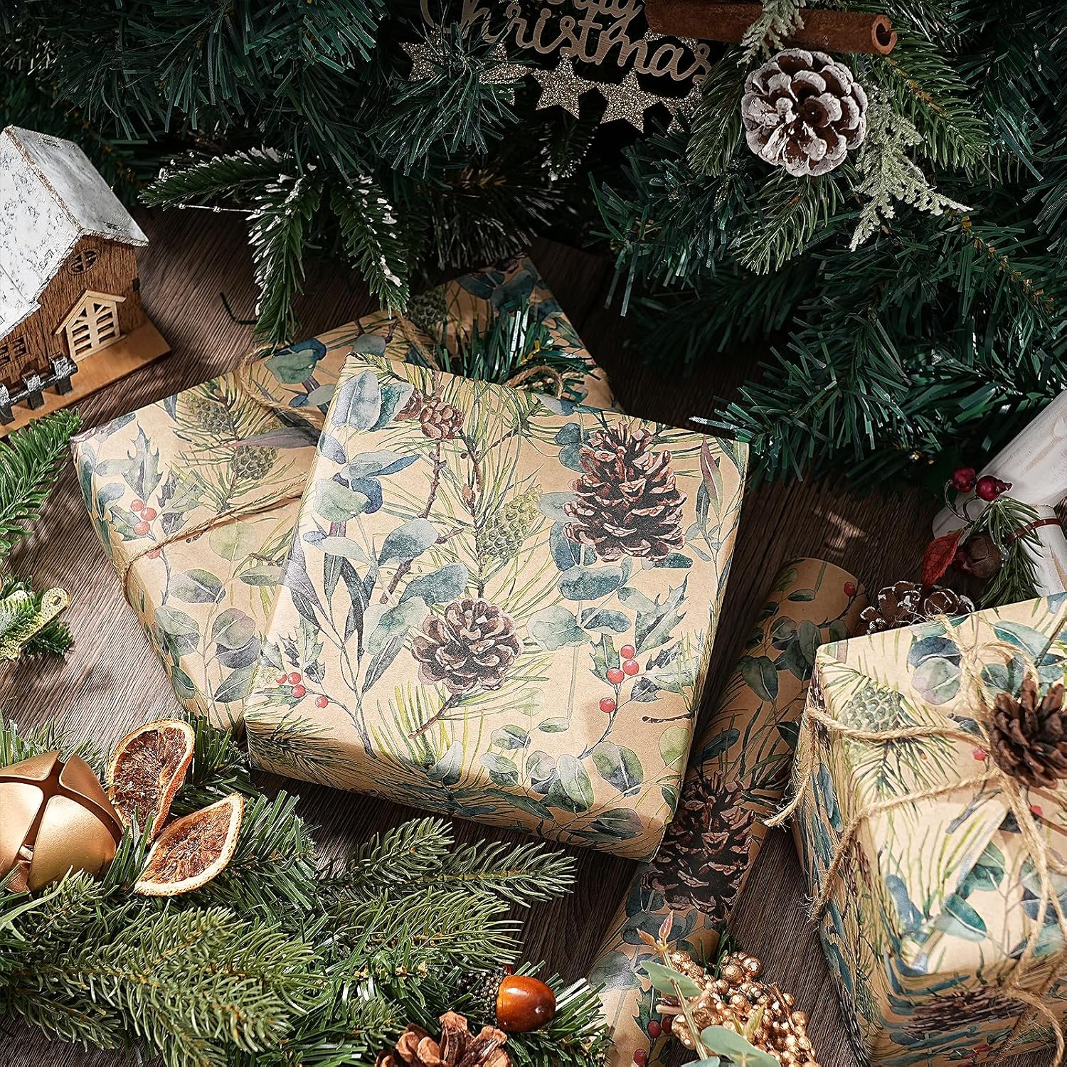 RUSPEPA 30" X 100' Kraft Christmas Wrapping Large Paper Roll, Jumbo Roll, Watercolor Pinecone and Eucalyptus Leaf Design, Kraft Gift Wrap for Christmas, Winter Holiday Party, Rustic Natural Theme