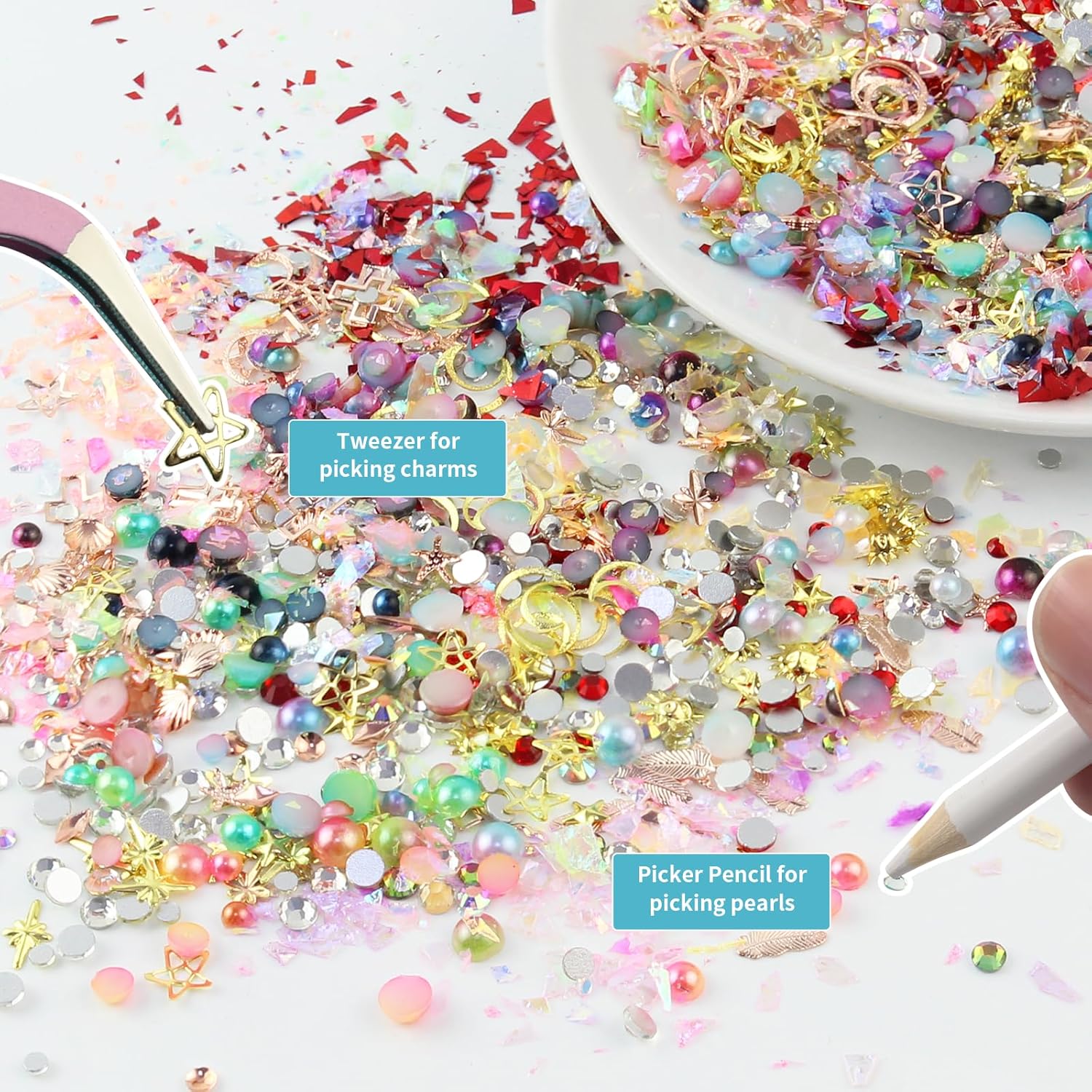 • Versatile Application: Beyond nails! These decorations work for DIY projects like phone cases, makeup (eyeshadow accents), or resin crafts. Mix and match the gold stickers, rhinestones, and charms to customize your style—glamorous, cute, or edgy. Perfect for personal use or as a gift for nail art enthusiasts.