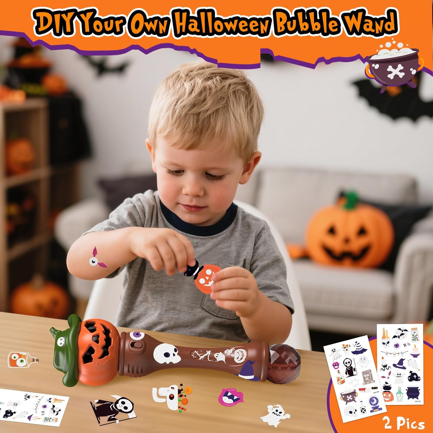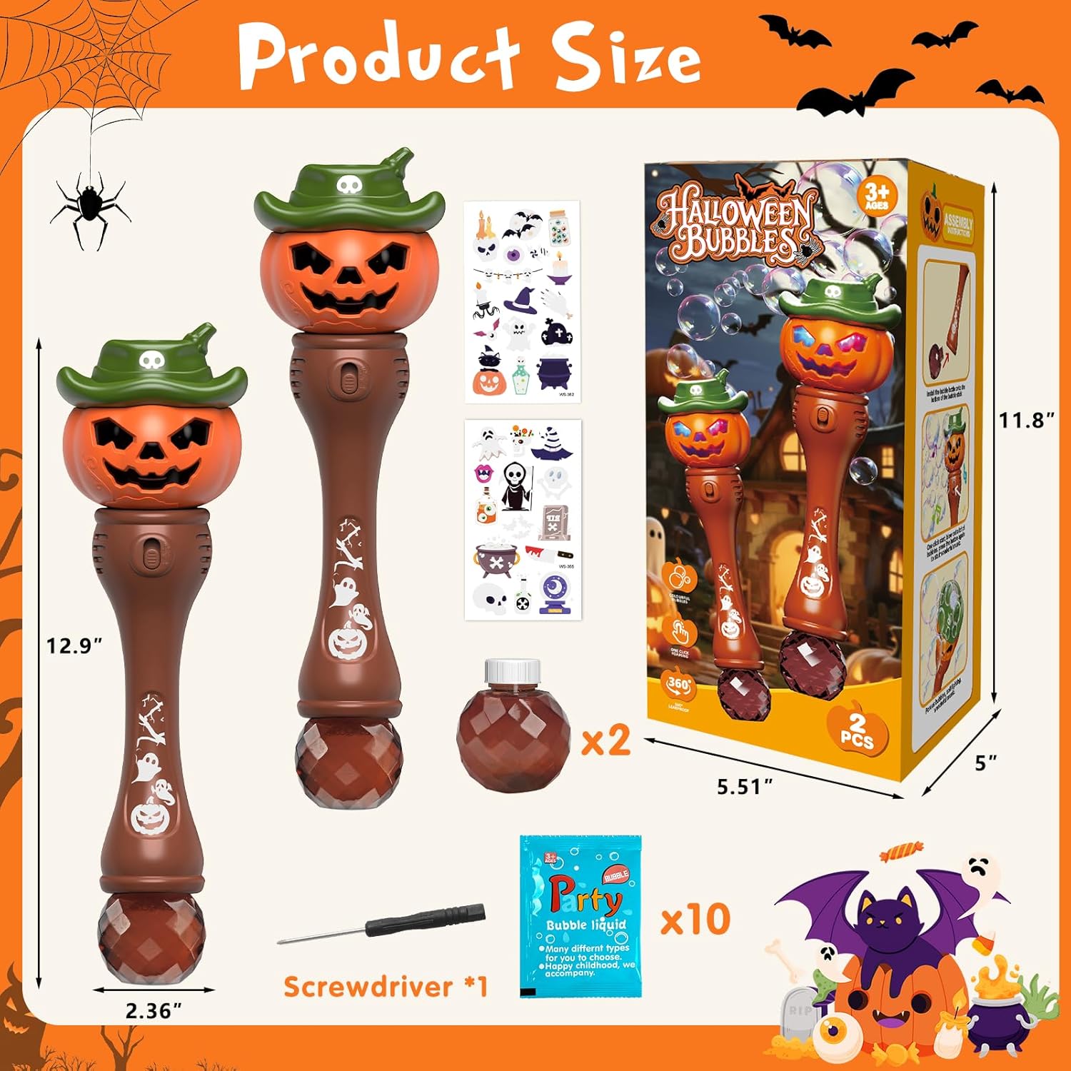Halloween Pumpkin Bubble Wand for Kids - 2 Pack Automatic Bubble Machine Blower Toys for Toddlers 3-8 with LED Lights, Music Function, DIY Stickers,10 Refill Solutions, Halloween Party Favors Gifts