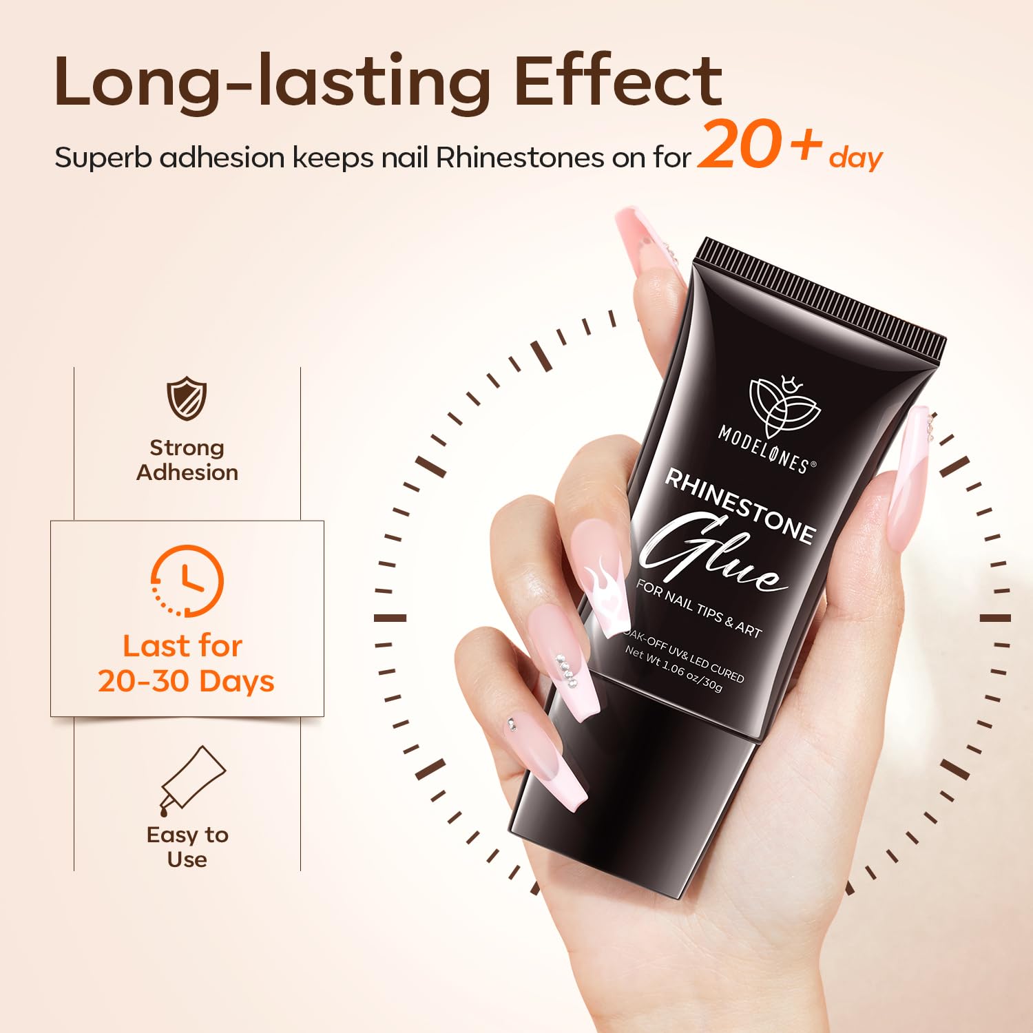 Modelones Manicure Tables Supports Growth 4-in-1 Rhinestone Glue - Super Strong for Press On Nails, Gems, Charms & Rhinestones, No Wipe Nail Art Glue, 30g Cured Needed