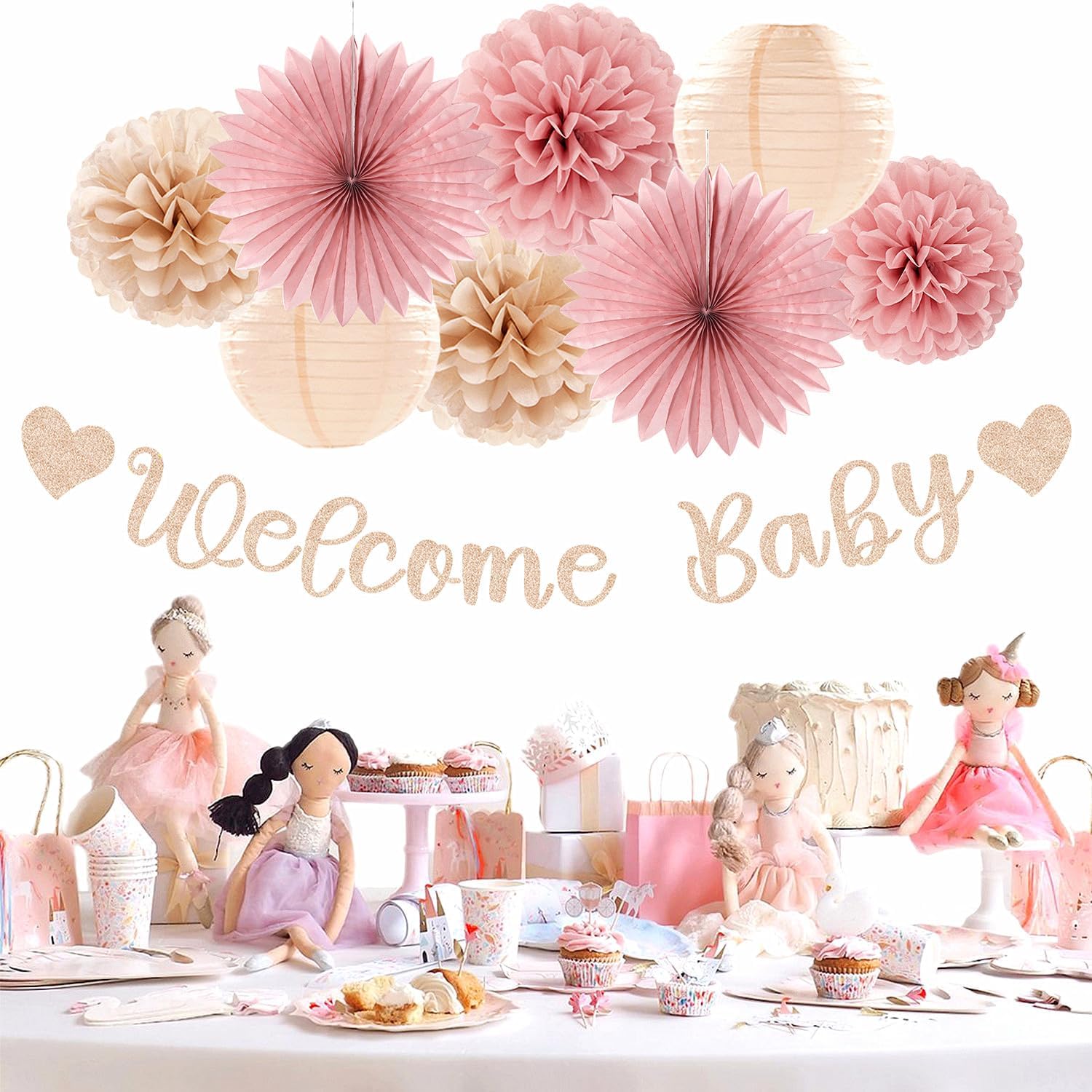 • 【Package Content】 Blush pink rose gold fall baby shower party decorations contains: 1 pcs welcome baby streamers banner sign, 1 pcs circle dots paper banner, 2 pcs paper lanterns, 4 pcs tissue paper pom poms, 2 pcs paper fans, 6 paper swirls and 15 pcs tassel garland, total 31 pcs in 8 10 12 inch and blush pink rose gold color.