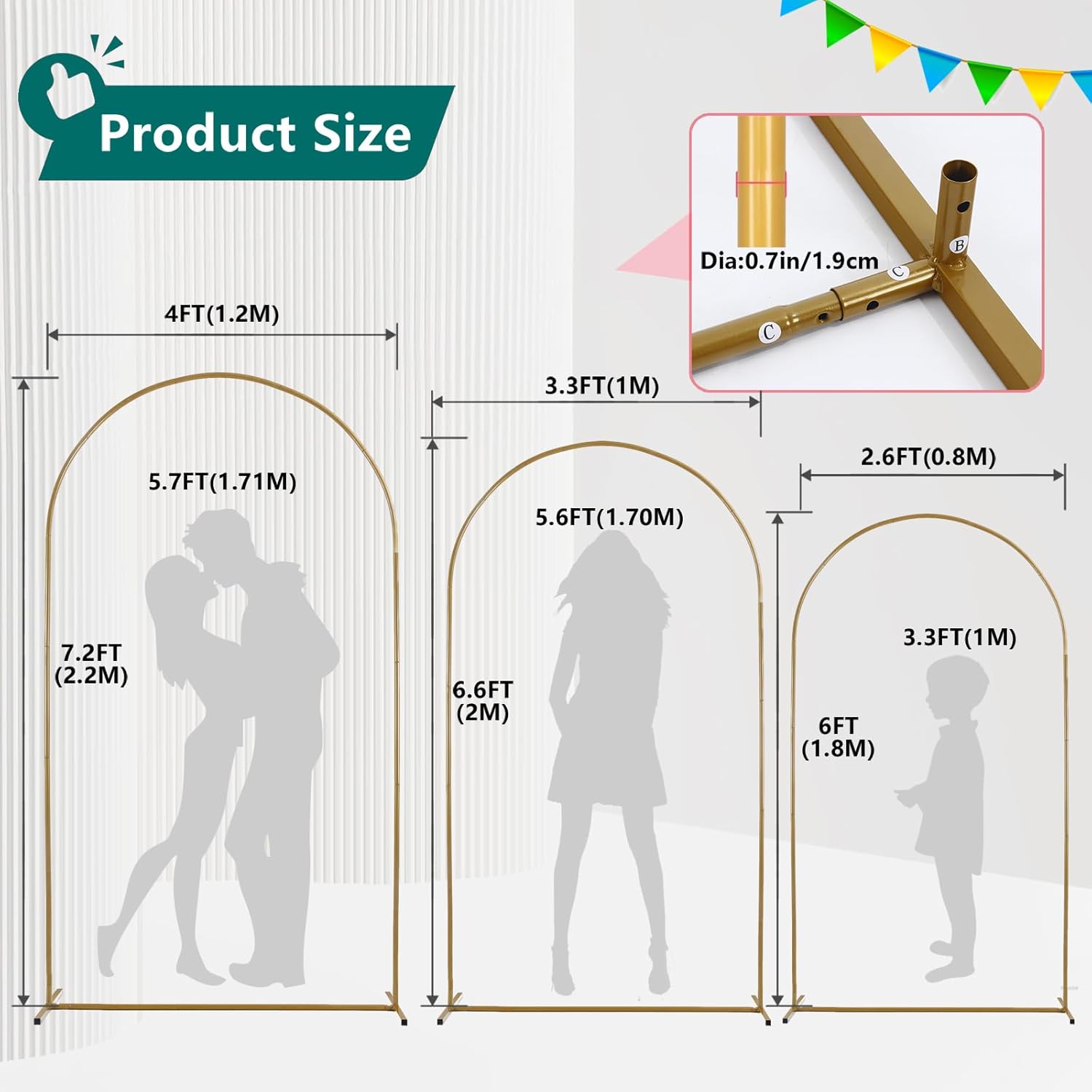 3-Pack Metal Arch Backdrop Stand Set (6/6.6/7.2FT) Heavy Duty Rust-Proof Wedding Decoration Frame with Crossbar Base for Party, Photo Booth, Balloon & Flowers Decor (Gold, 6FT,6.6FT,7.2FT)
