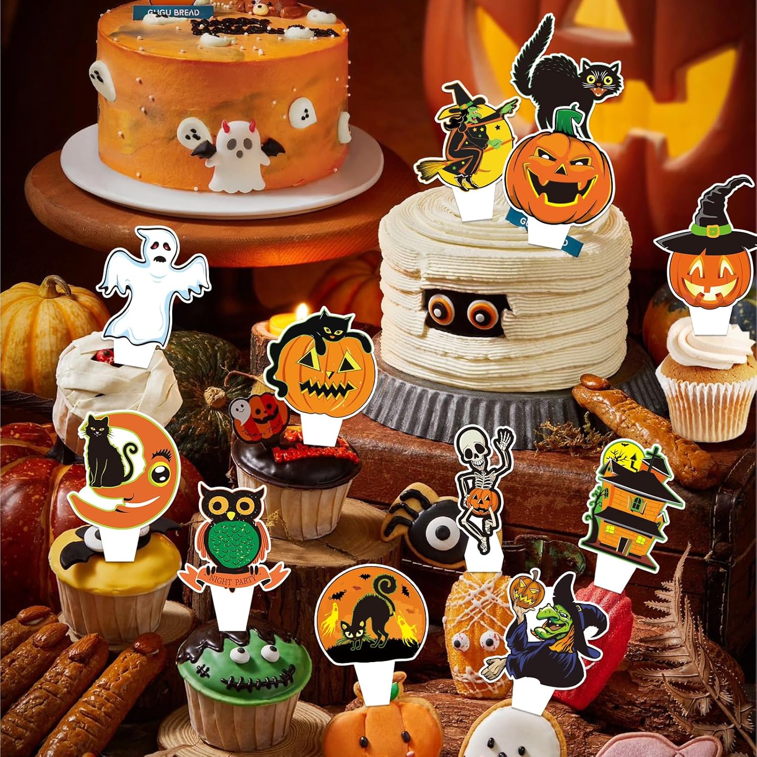 • Halloween Theme: Create a special party with these 24 Halloween cupcake toppers. Each Halloween cupcake topper is perfect for a Halloween-themed party.