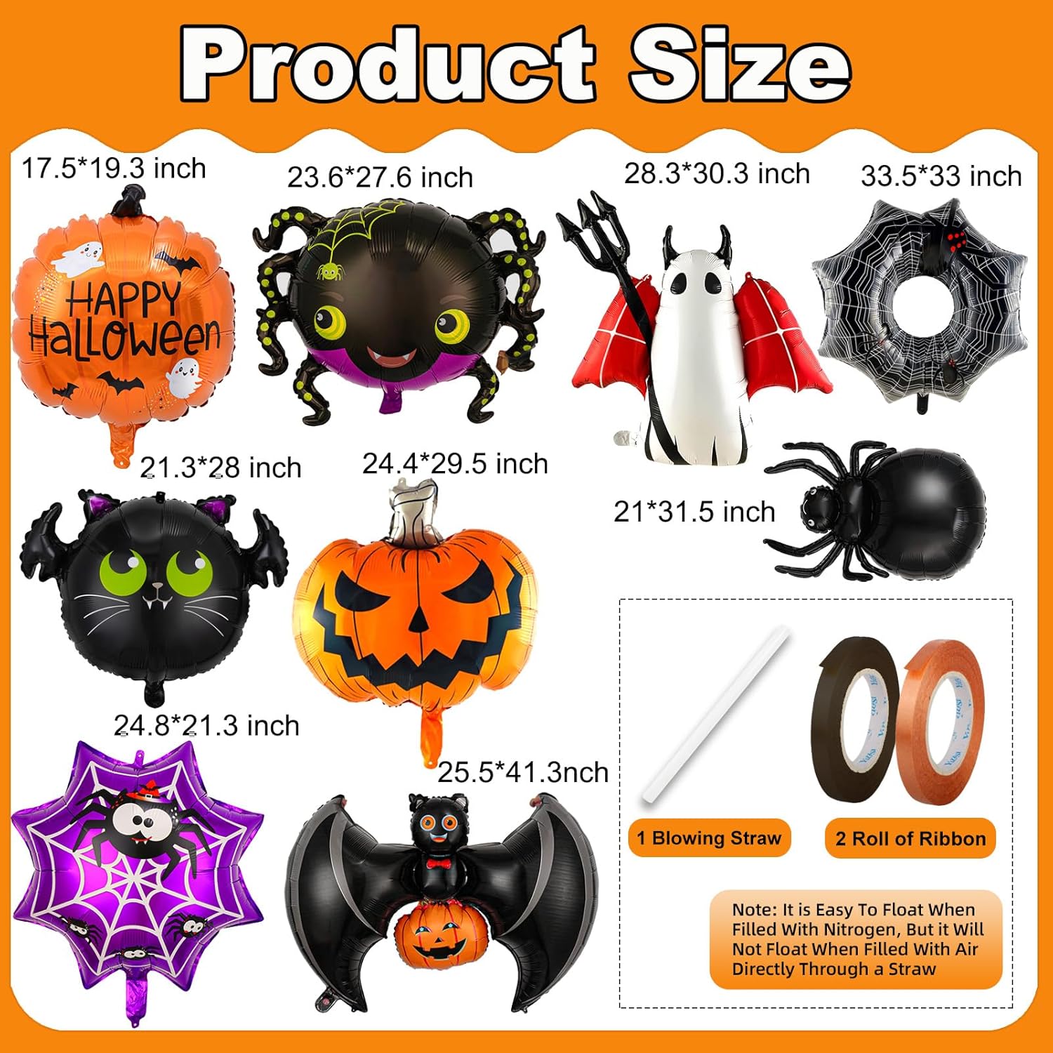 • Complete 9-Piece Halloween Balloon Set for Spooky Decor: Includes premium foil balloons (spider, pumpkin, bat & ghost) to create instant Halloween atmosphere; perfect for haunted houses, trick-or-treat setups, and party backdrops