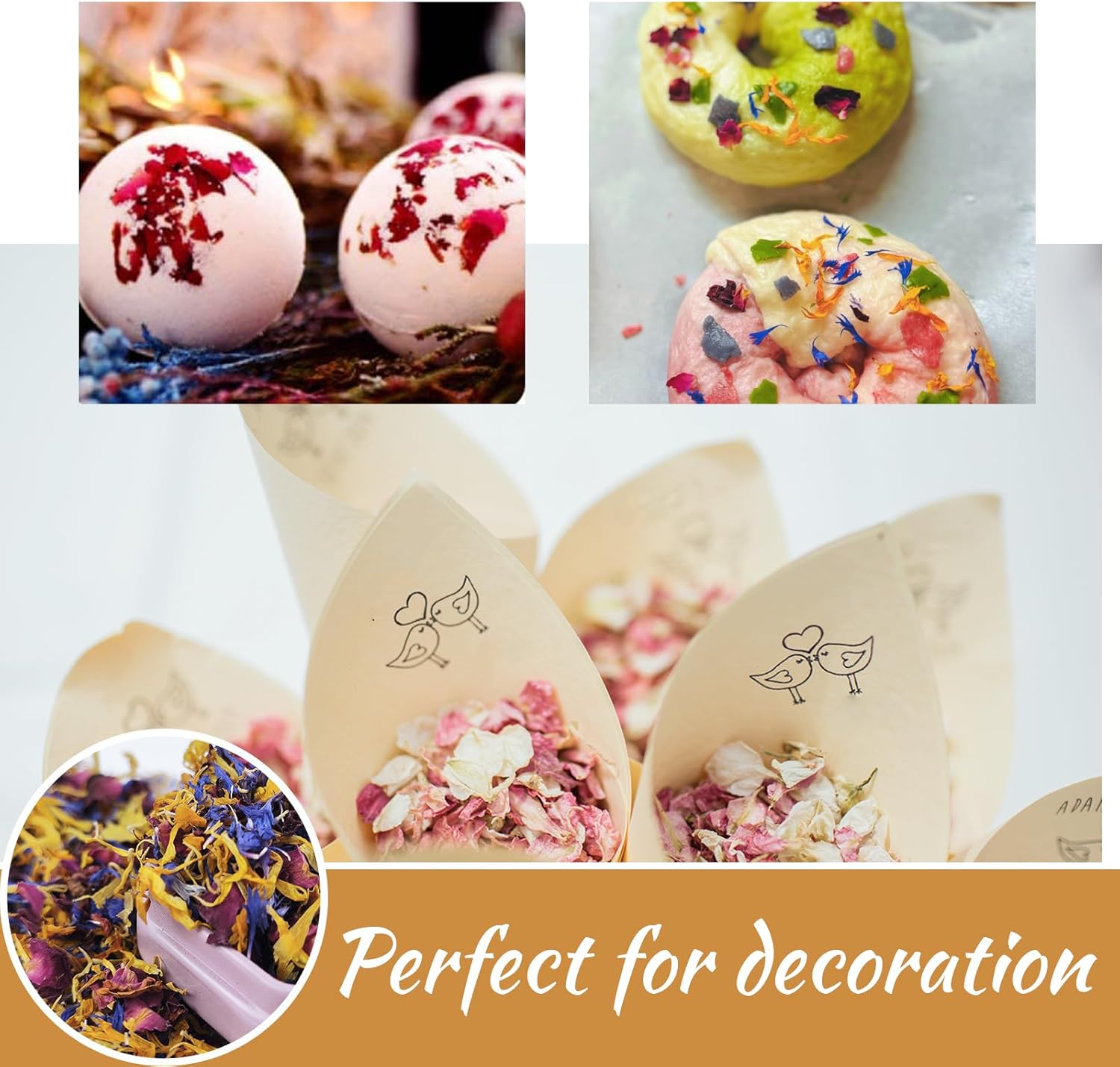 • DIY Craft Uses: Carefully handpicked flowers retain their colors and fragrance, used for cakes, potpourri, bath bombs, bath salts, confetti and table centerpieces