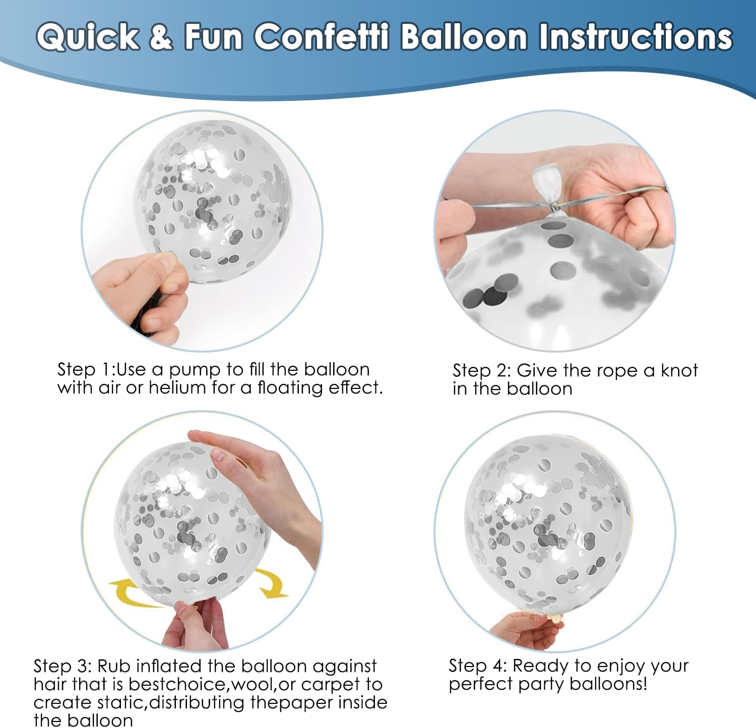 • 【 Confetti Balloon】Due to the blue and silver confetti balloons is heavier than helium, the confetti moves in the direction of gravity. Rubbing the outer side of the balloon on the hair (the best way )or silk, wool, will help the confetti stick to the balloon. A balloon pump is strongly recommended. This will make the balloons look more beautiful.