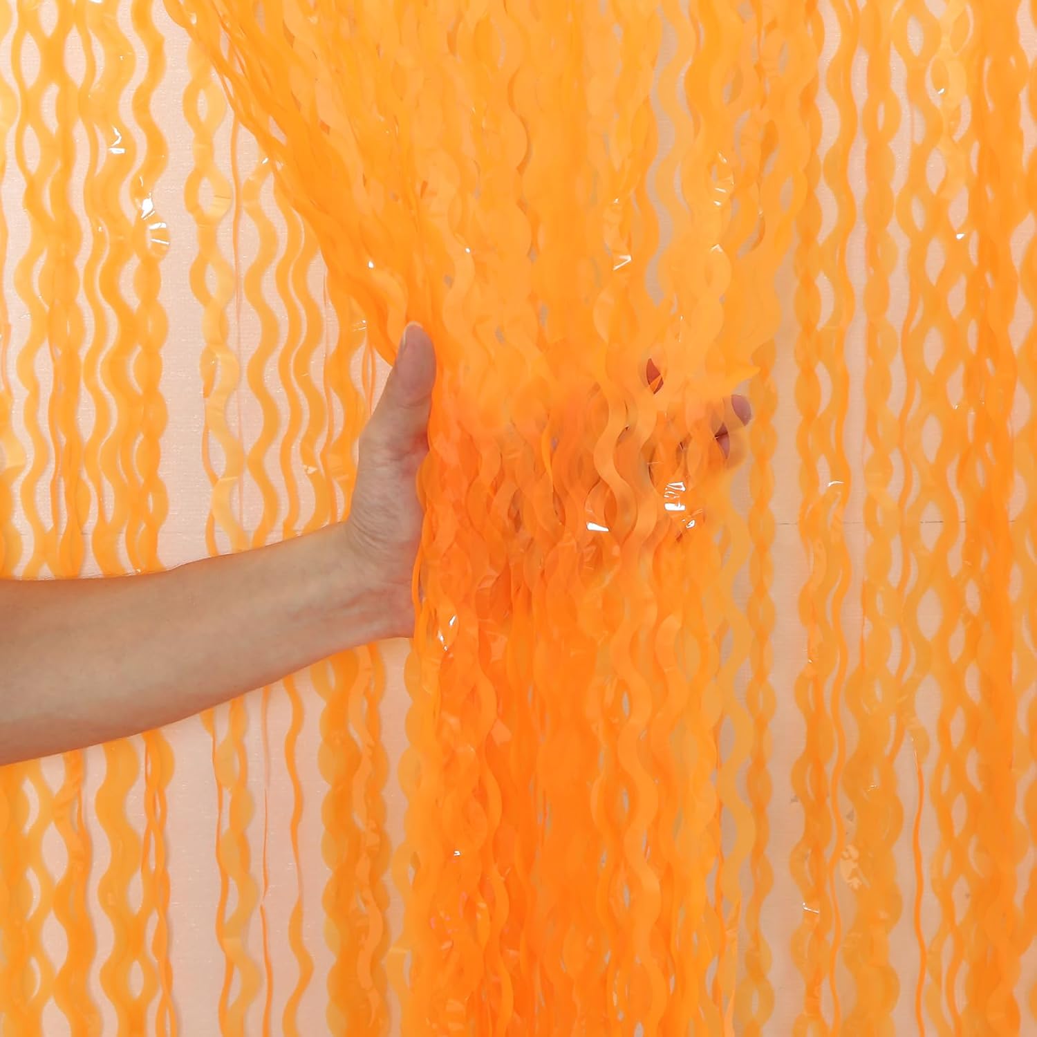• 【LATEST Shiny Surface +Wavy Shape Tinsel Backdrop】The orange foil curtain backdrop is made of aluminium foil with shiny surface +wavy shape, good for adding sparkle as decorations for parties