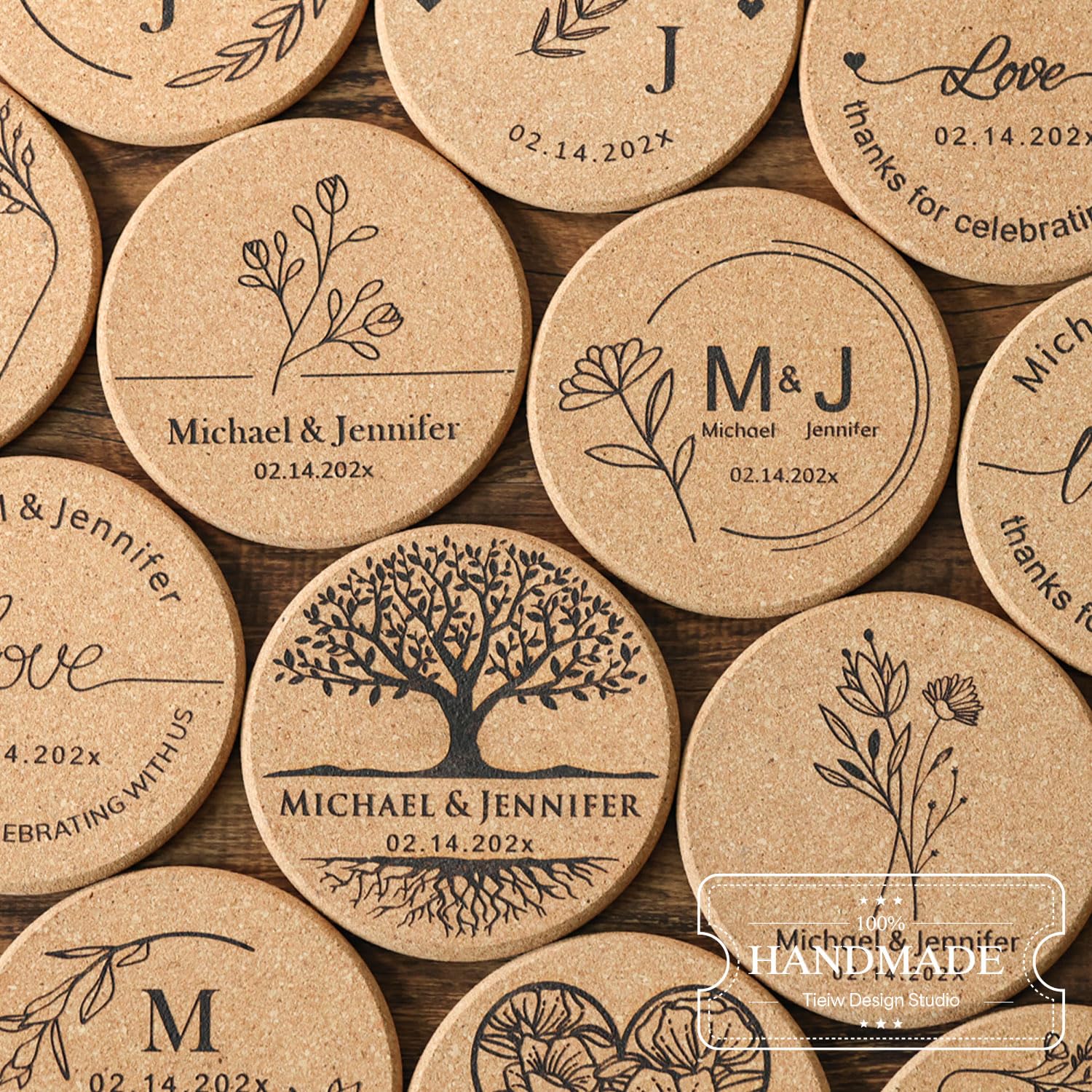 Personalized Cork Coasters - Custom Engraved Wedding Favor,Natural Round Drink Coasters, Bulk Guest Gifts, Bridal Shower,Party,Reception and Anniversary Gift Decor - Set of 25-300pcs