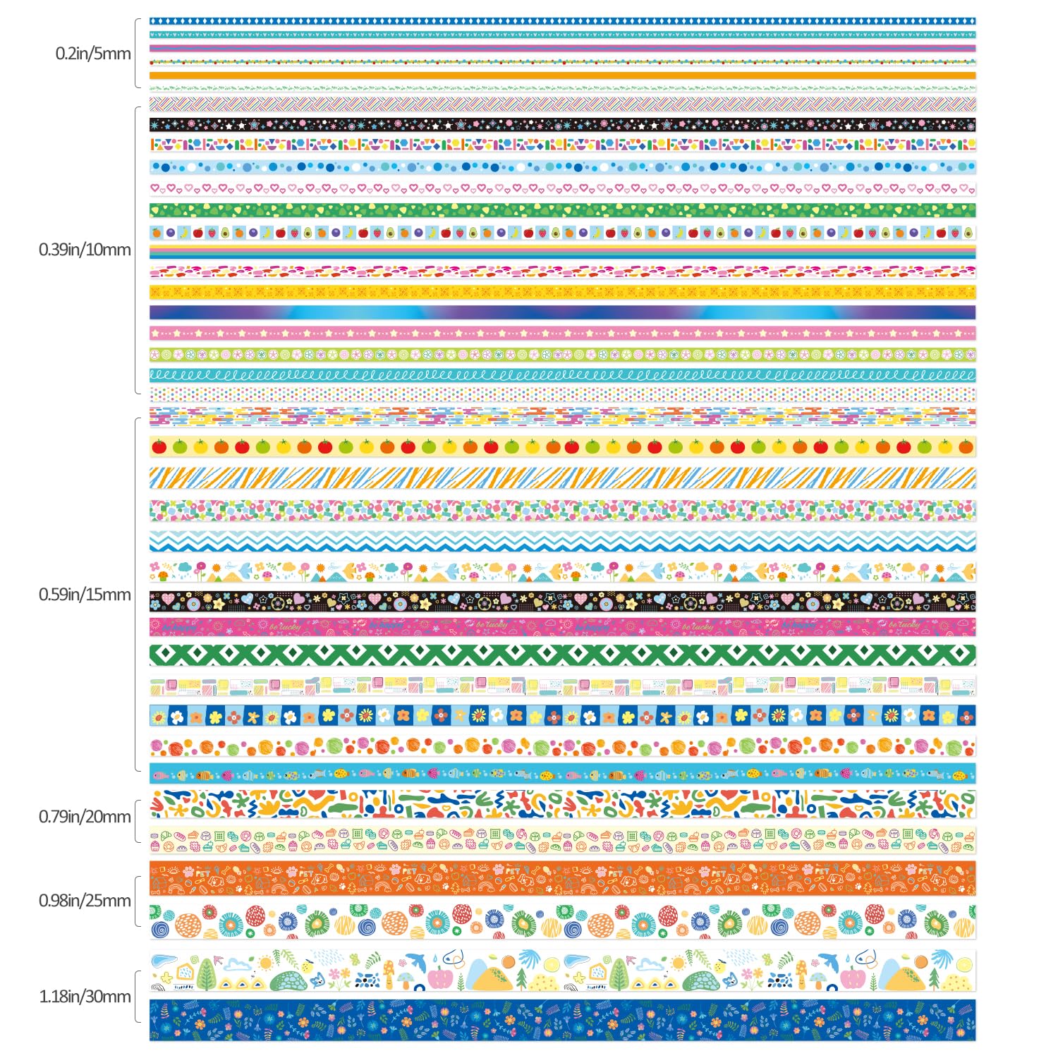 • ✨40 Rolls Palette Days Washi Tape, 1.18 inch (30mm) wide x 2 tapes; 0.98 inch (25mm) wide x 2 tapes; 0.79 inch (20mm) wide x 2 tapes; 0.59 inch (15mm) wide x 13 tapes; 0.39 inch (10mm) wide x 15 tapes; 0.19 inch (5mm) wide x 6 tapes. These different series and sufficient quantity washi paper tapes can meet your use and replacement needs.