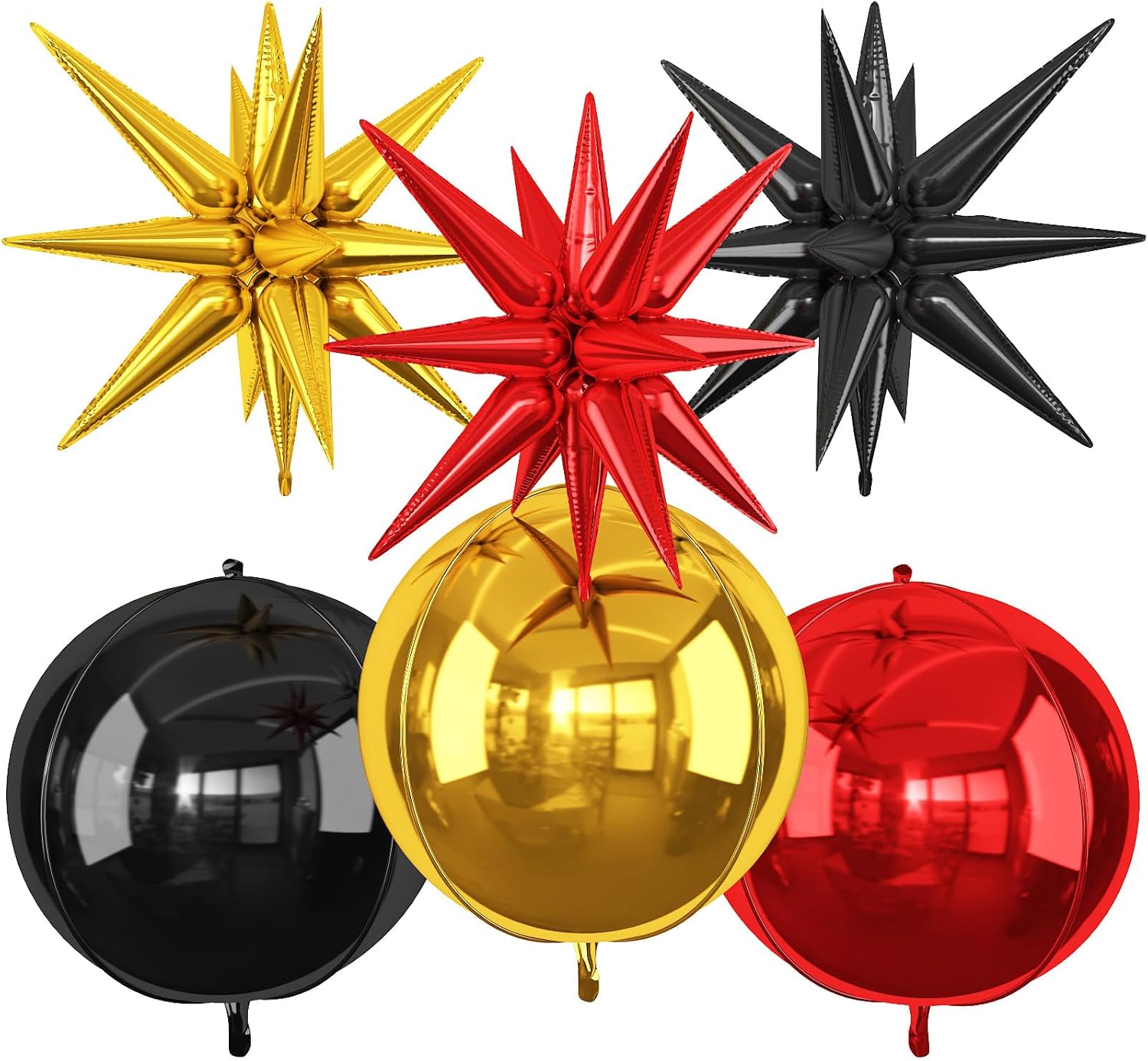6Pcs Black Red Gold Foil Balloons,22Inch Black Gold Red 4D Round Ball Balloon and Explosion Star Balloon for Birthday Wedding Baby Shower Anniversary Party Decorations