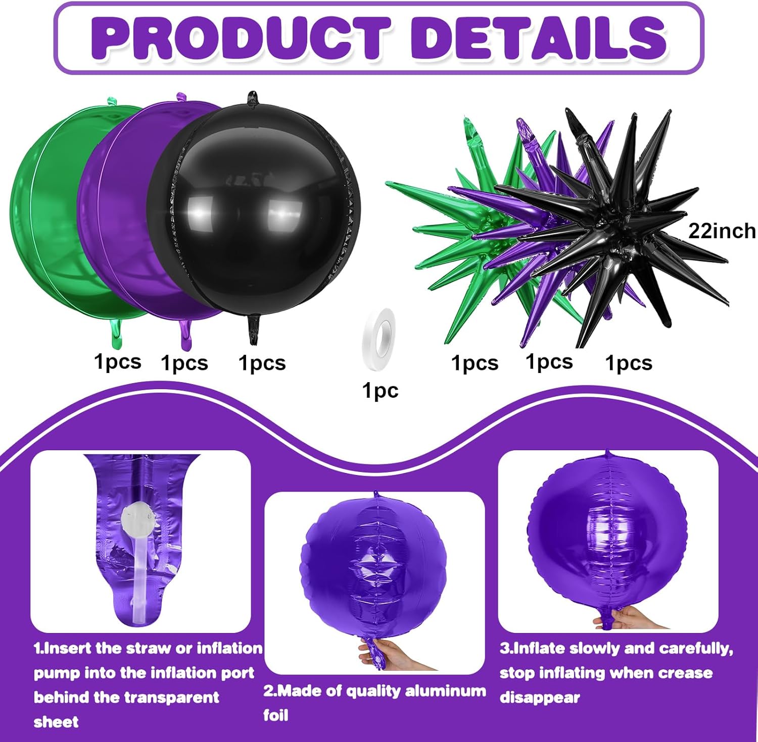 • 【Easy Use】Our black green purple star and round star and round foil balloons are easy to inflate. The straw inside the package can help you inflate the balloon. After inflation, you can pinch your fingers to the position of the inflation to automatically seal it.