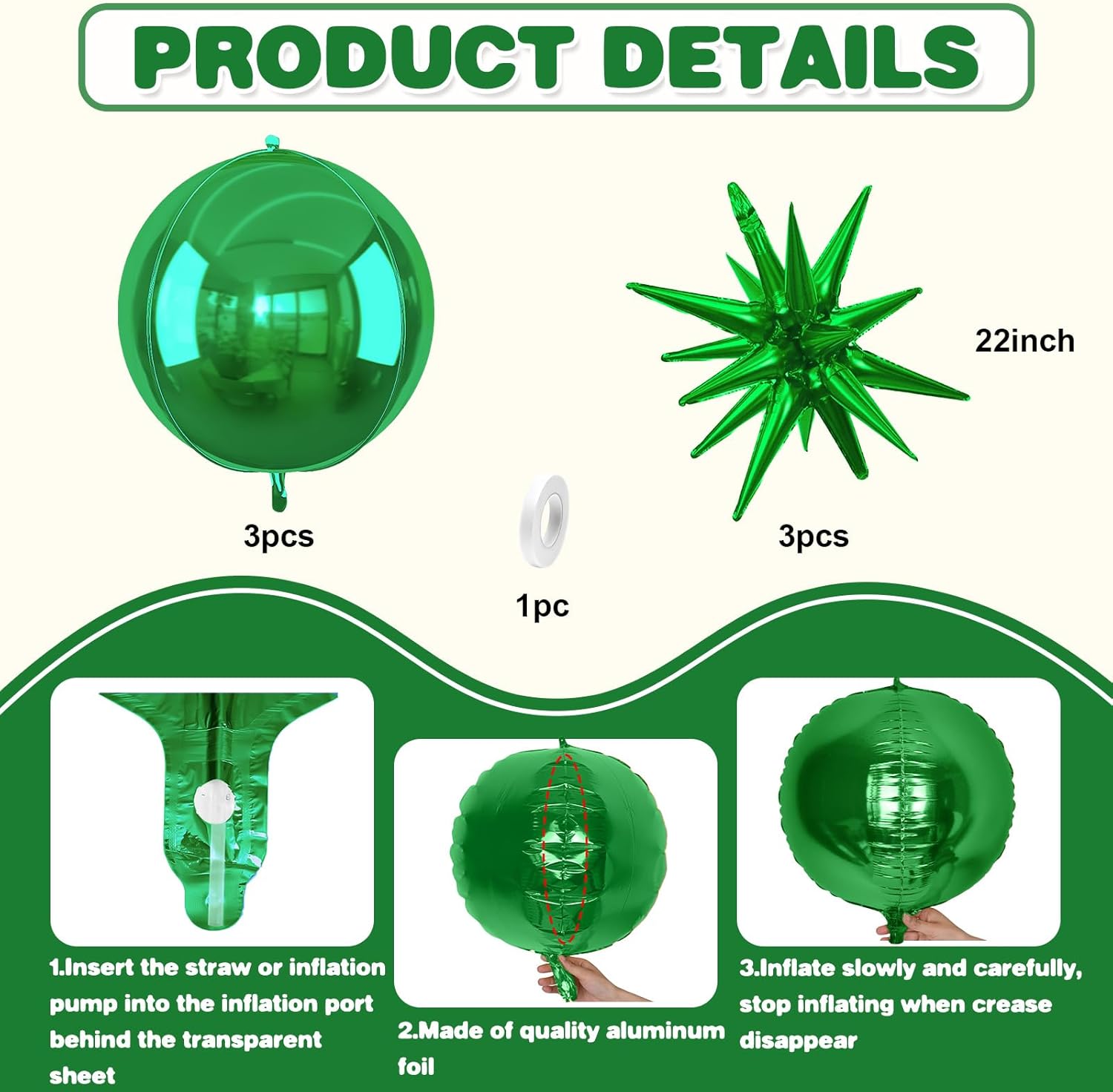 • 【Package】The package includes 3pcs 22Inch green 4D ball foil balloons, 3pcs 22Inch green star foil balloons,and ribbon.These huge balloons can help you decorate your party better.