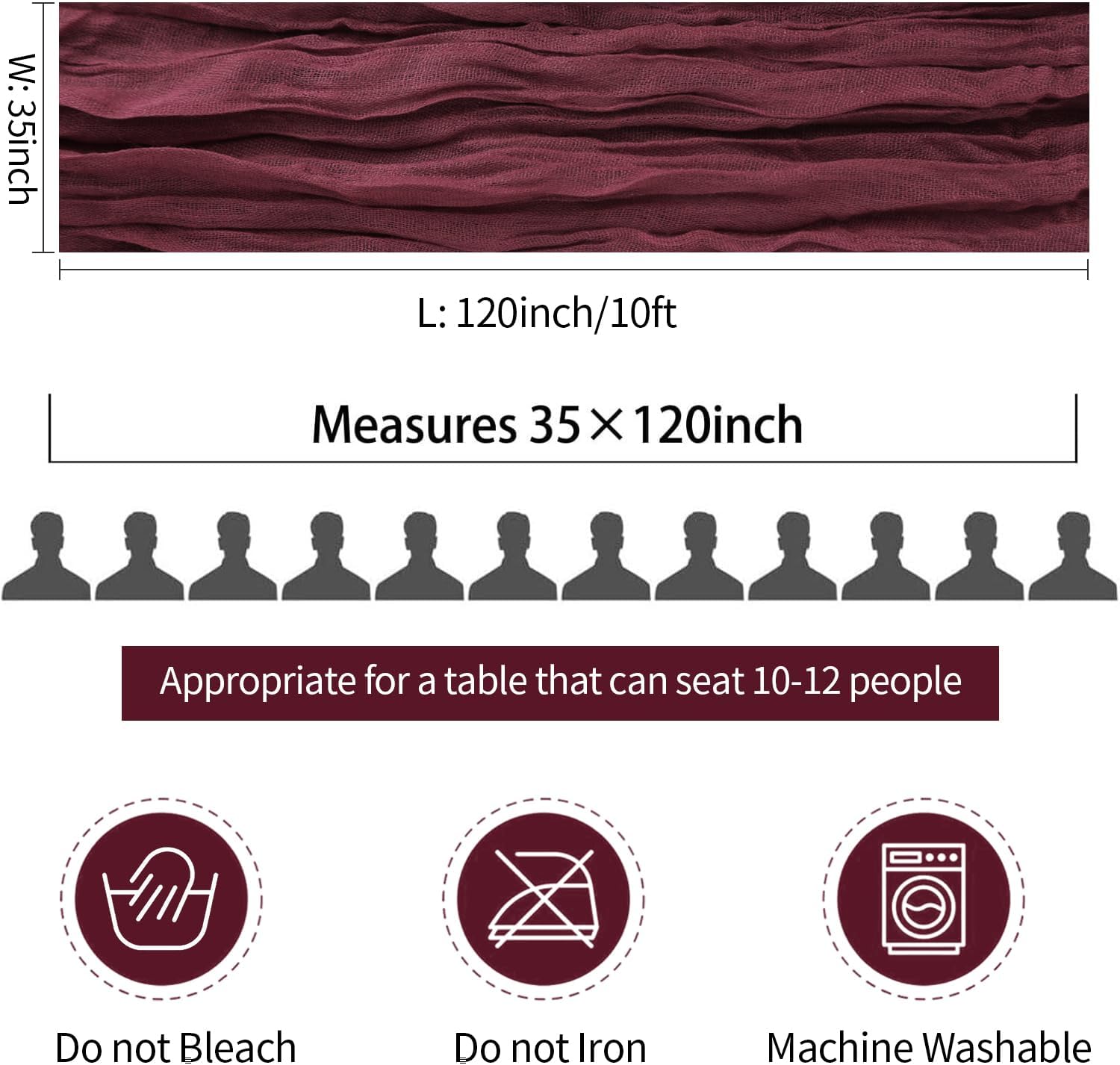 • 🍷【Care Instructions】These vintage dark red table runner cheesecloth are recommended for hand wash in cold water with mild detergent, or machine wash in the gentle cycle with a laundry bag; In order to maintain wrinkled texture, please do not iron or use hot water, lay flat or hang dry, do not bleach or soak for too long time, which are better for keeping these red cheese cloth table runner for a long time use. Please kindly noted that there might be color variation due to screen resolution and limitations in photography.