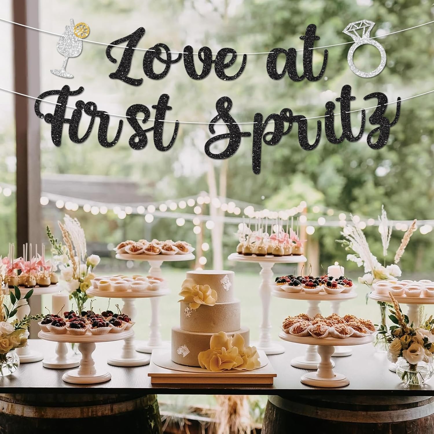 Love At First Spritz Wedding Banner - Bridal Shower Decorations, No Diy, Glitter Just Engaged Spritz Party Banners for Wedding/Engagement/Bachelorette Party Decorations Supplies, Black.