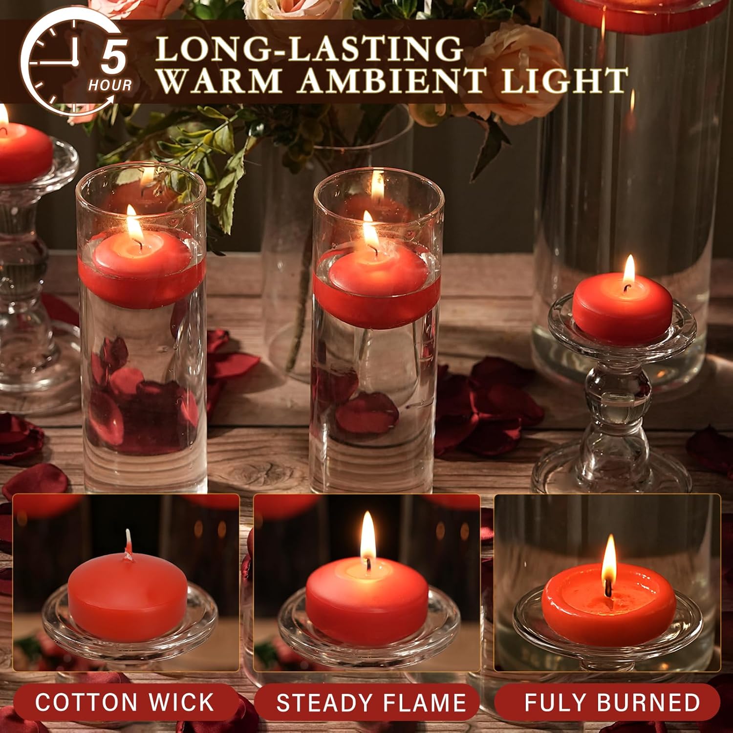 • 【LONG-LASTING & CLEAN BURNING 2 IN FLOAT CANDLES】Made high-quality paraffin wax, ensuring a bright, steady flame and a clean burn, these red floating candles provide a long and steady burn time of 5-6 hours. They are unscented and drip-resistant, ensuring a clean burn without mess. Ginitiri floating candles are hypoallergenic,ideal for water decorations in pools, bathtubs, or centerpiece vases