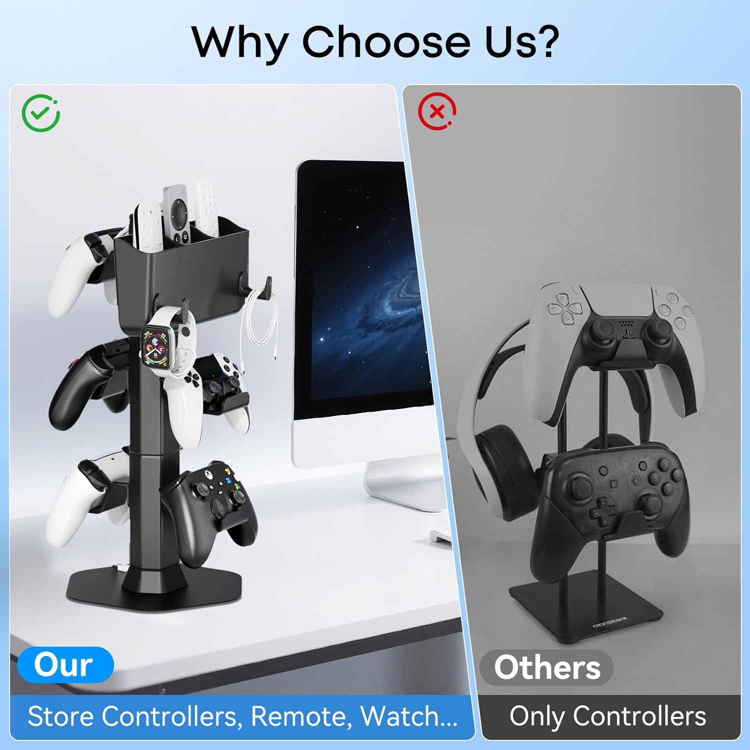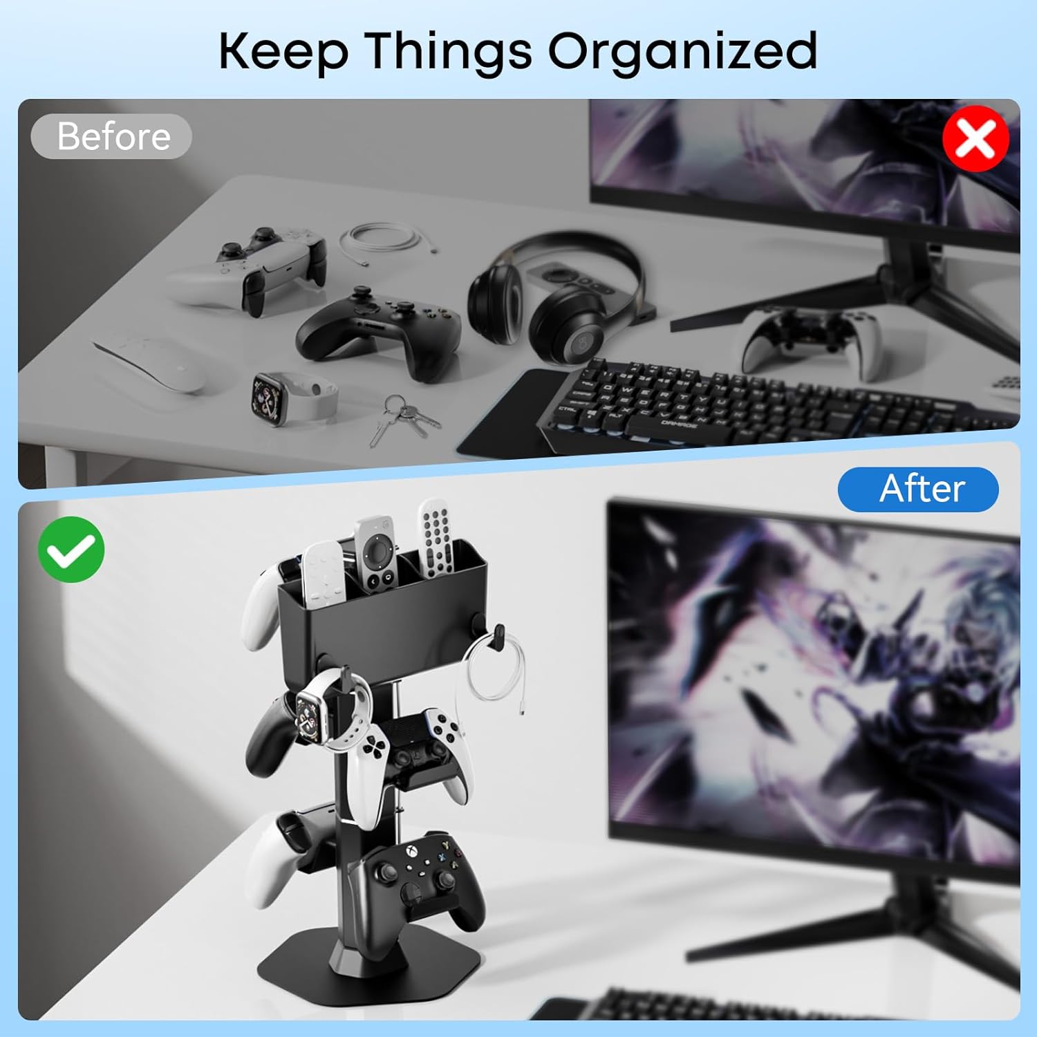 • Perfect Storage: This gaming accessories can accommodate up to 5 controllers (or 1 controller and 2 headphones), 3 remote controls, and some miscellaneous items such as watches and wires. In addition, the headset holder for desk is designed with a wire storage device, which can make your wires more organized. Without the need for installation tools, with the help of the user manual, you can easily install layers 1-3 as needed.