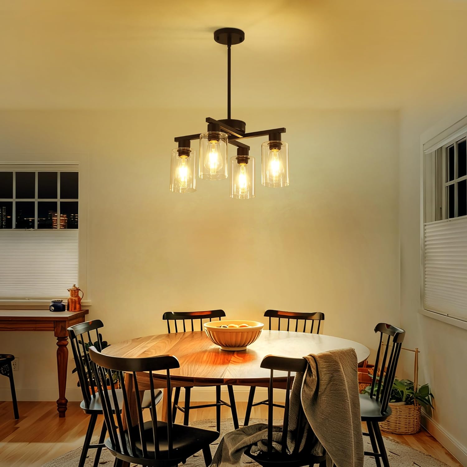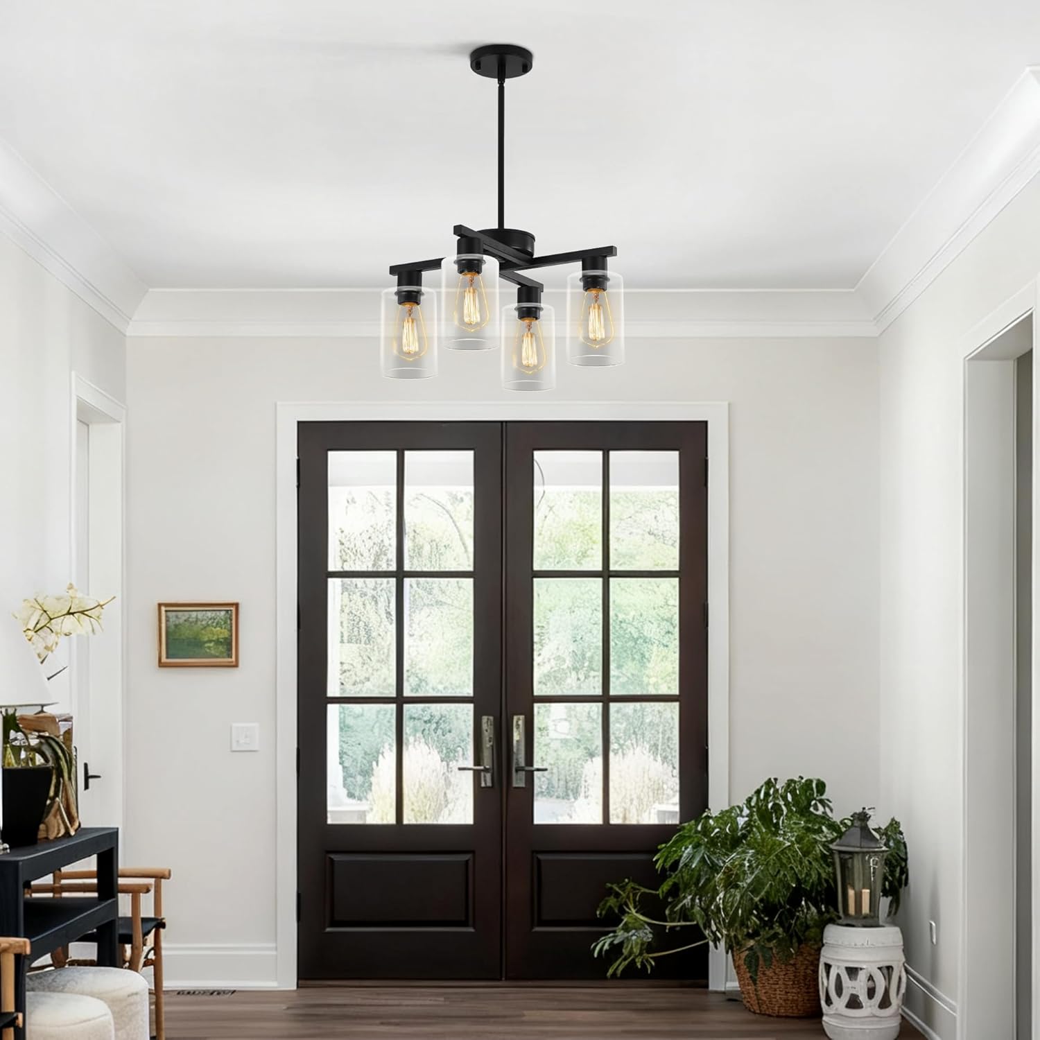 • 【Unique Contemporary Design】This black chandelier has 2 elegant “Y” shaped arms that reach out from the center in a distinctive interlocking shape, paired with 4 cylindrical glass shades to create a striking geometric silhouette. The modern glass chandelier body is crafted from high quality metal with a matte finish for a premium and classy texture. The transparent glass shades are like a light veil, gently wrapping the light and scattering it softly. The shades and the metal body reflect each other, perfectly blending the ruggedness of the industrial style with the sophistication of the glass, highlighting the unique style.