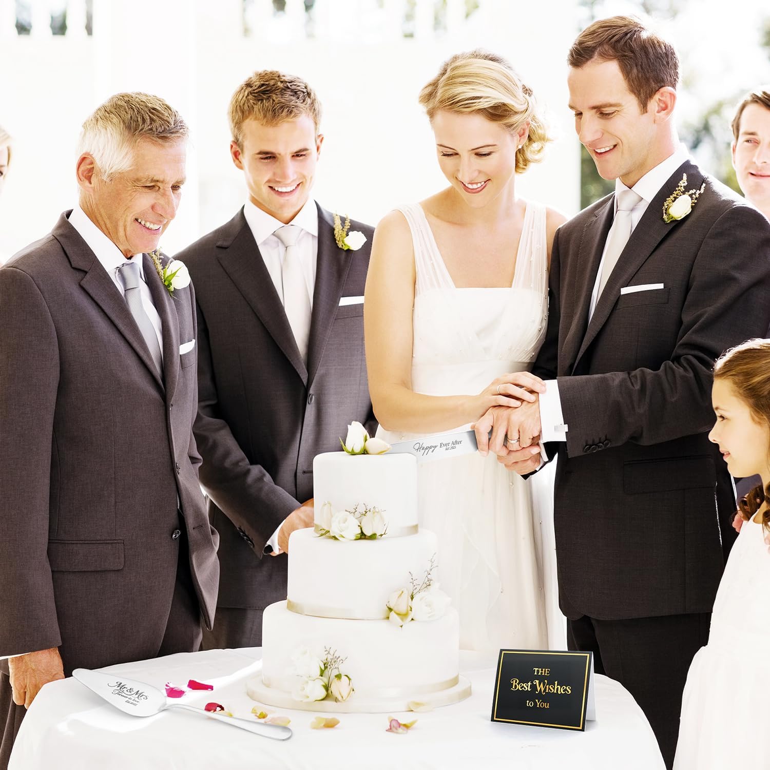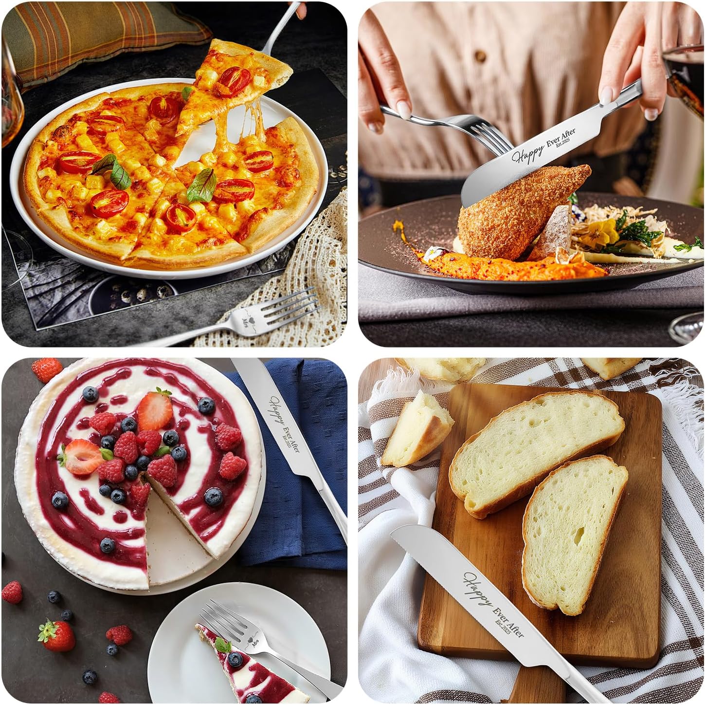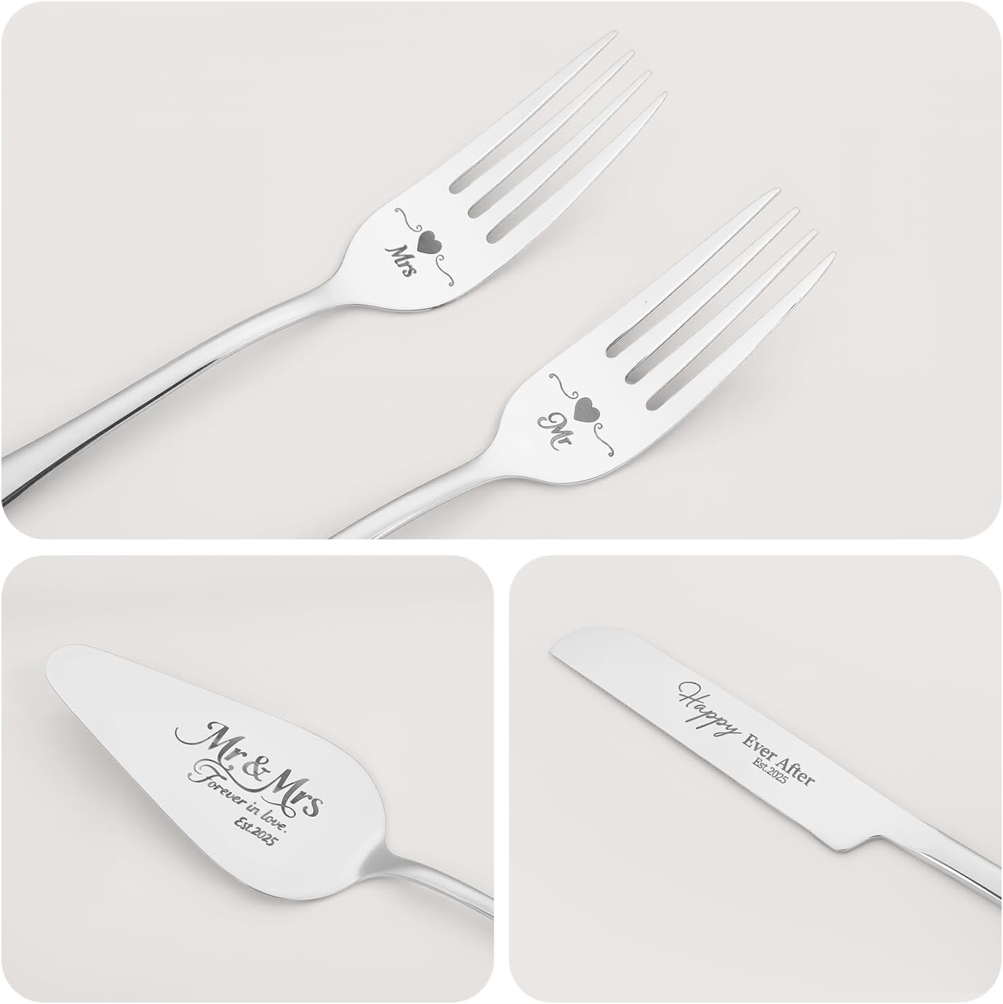 • 【Designed for Weddings】This wedding cake knife and server set includes a tray engraved with “Mr & Mrs Forever in Love Est.2025”, a cake knife with “Happy Ever After”, and two forks engraved with “Mr” and “Mrs.” The set comes in a premium gift box with the Forever in Love Est.2025 theme. Its elegant design brings charm to your special day and symbolizes a new journey of happiness together."