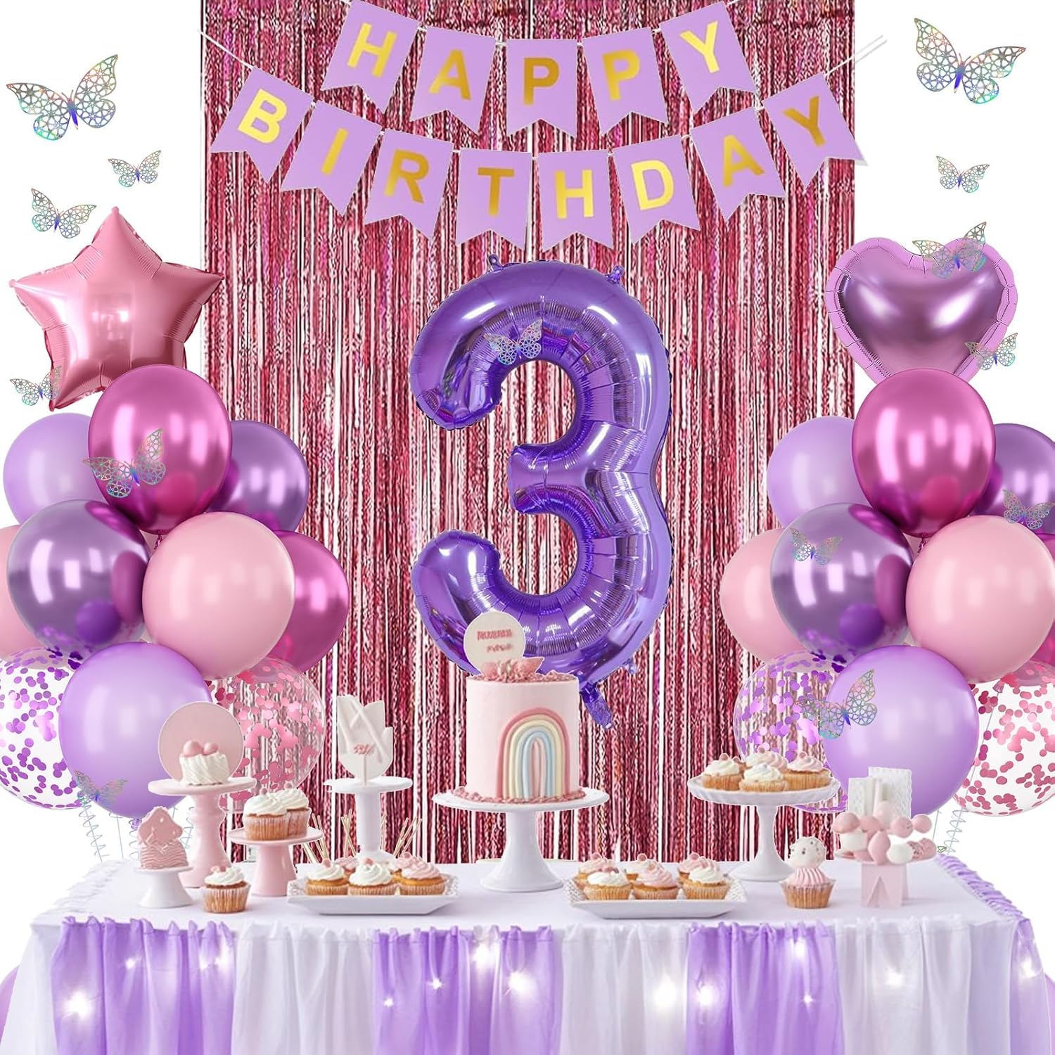 • PACKAGE INCLUDES: 1pc purple number 3 balloon, 1pc happy birthday banner, 2pcs light pink paper pom poms, 2pcs light purple paper pom poms, 2pcs hot pink paper pom poms, 1pc light pink fringe curtain, 1pc light pink star foil balloons, 1pc light purple heart foil balloons, 6pcs pastel purple balloons, 6pcs pastel pink balloons, 4pcs metallic purple balloons, 4pcs metallic magenta balloons, 3pcs purple confetti ballons, 3pcs pink confetti ballons, 1pc butterfly stickers set, 1pc ribbon