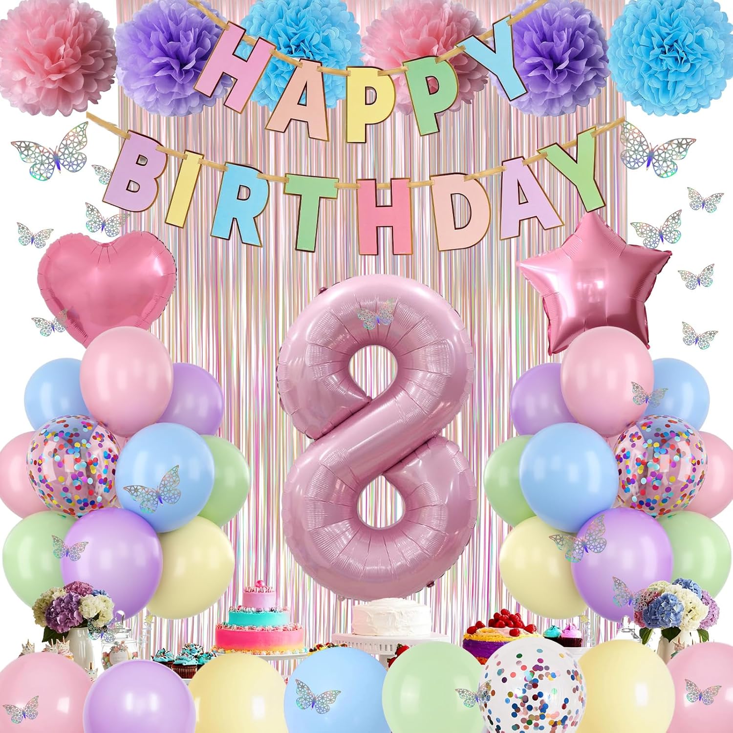 • PACKAGE INCLUDES: 1pc pearl pink number 8 balloon, 1pc happy birthday banner, 2pcs light pink paper pom poms, 2pcs light purple paper pom poms, 2pcs light blue paper pom poms, 1pc colorful white curtain, 1pc light pink star foil balloons, 1pc light pink heart foil balloons, 4pcs pastel purple balloons, 4pcs pastel pink balloons, 4pcs pastel blue balloons, 4pcs pastel green balloons, 4pcs pastel yellow balloons, 4pcs colorful confetti balloons, 1pc butterfly stickers set, 1pc ribbon
