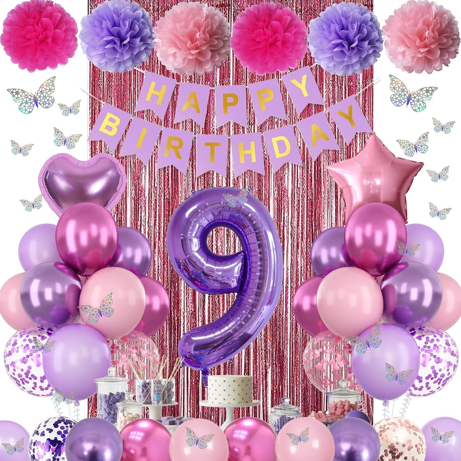 • PACKAGE INCLUDESο»Ώ: 1pc purple number 9 balloon, 1pc happy birthday banner, 2pcs light pink paper pom poms, 2pcs light purple paper pom poms, 2pcs hot pink paper pom poms, 1pc light pink fringe curtain, 1pc light pink star foil balloons, 1pc light purple heart foil balloons, 6pcs pastel purple balloons, 6pcs pastel pink balloons, 4pcs metallic purple balloons, 4pcs metallic magenta balloons, 3pcs purple confetti ballons, 3pcs pink confetti ballons, 1pc butterfly stickers set, 1pc ribbon