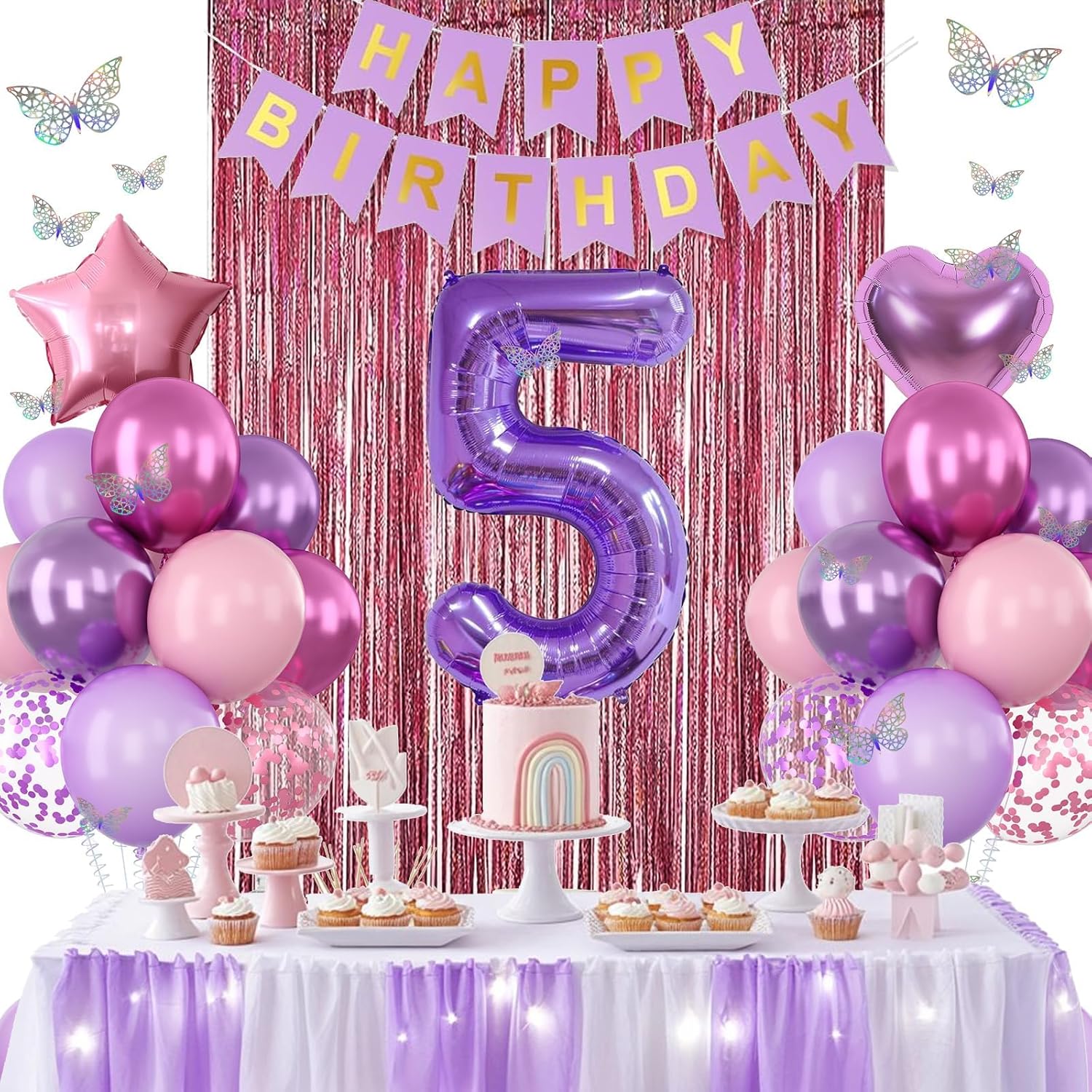 • PACKAGE INCLUDES: 1pc purple number 5 balloon, 1pc happy birthday banner, 2pcs light pink paper pom poms, 2pcs light purple paper pom poms, 2pcs hot pink paper pom poms, 1pc light pink fringe curtain, 1pc light pink star foil balloons, 1pc light purple heart foil balloons, 6pcs pastel purple balloons, 6pcs pastel pink balloons, 4pcs metallic purple balloons, 4pcs metallic magenta balloons, 3pcs purple confetti ballons, 3pcs pink confetti ballons, 1pc butterfly stickers set, 1pc ribbon