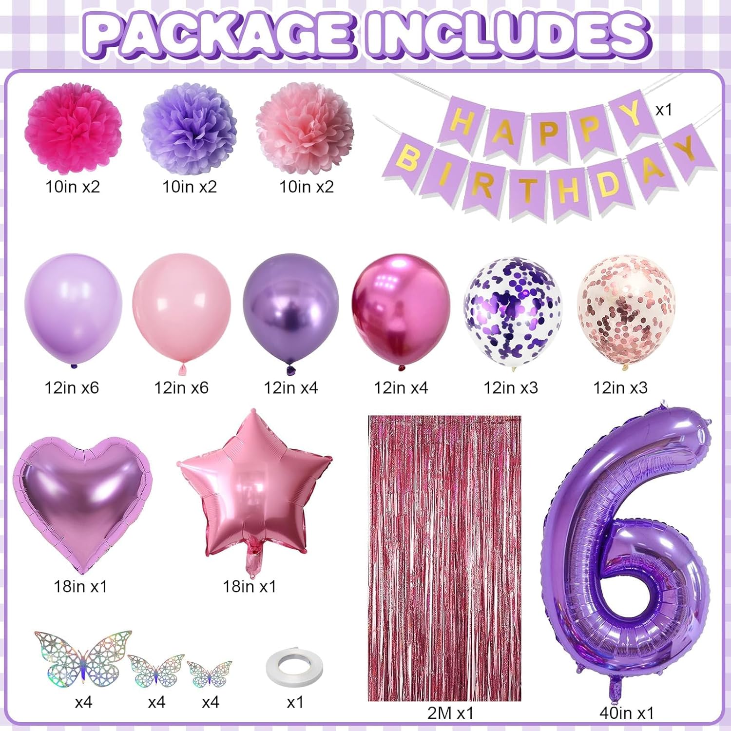 • PACKAGE INCLUDES: 1pc purple number 6 balloon, 1pc happy birthday banner, 2pcs light pink paper pom poms, 2pcs light purple paper pom poms, 2pcs hot pink paper pom poms, 1pc light pink fringe curtain, 1pc light pink star foil balloons, 1pc light purple heart foil balloons, 6pcs pastel purple balloons, 6pcs pastel pink balloons, 4pcs metallic purple balloons, 4pcs metallic magenta balloons, 3pcs purple confetti ballons, 3pcs pink confetti ballons, 1pc butterfly stickers set, 1pc ribbon