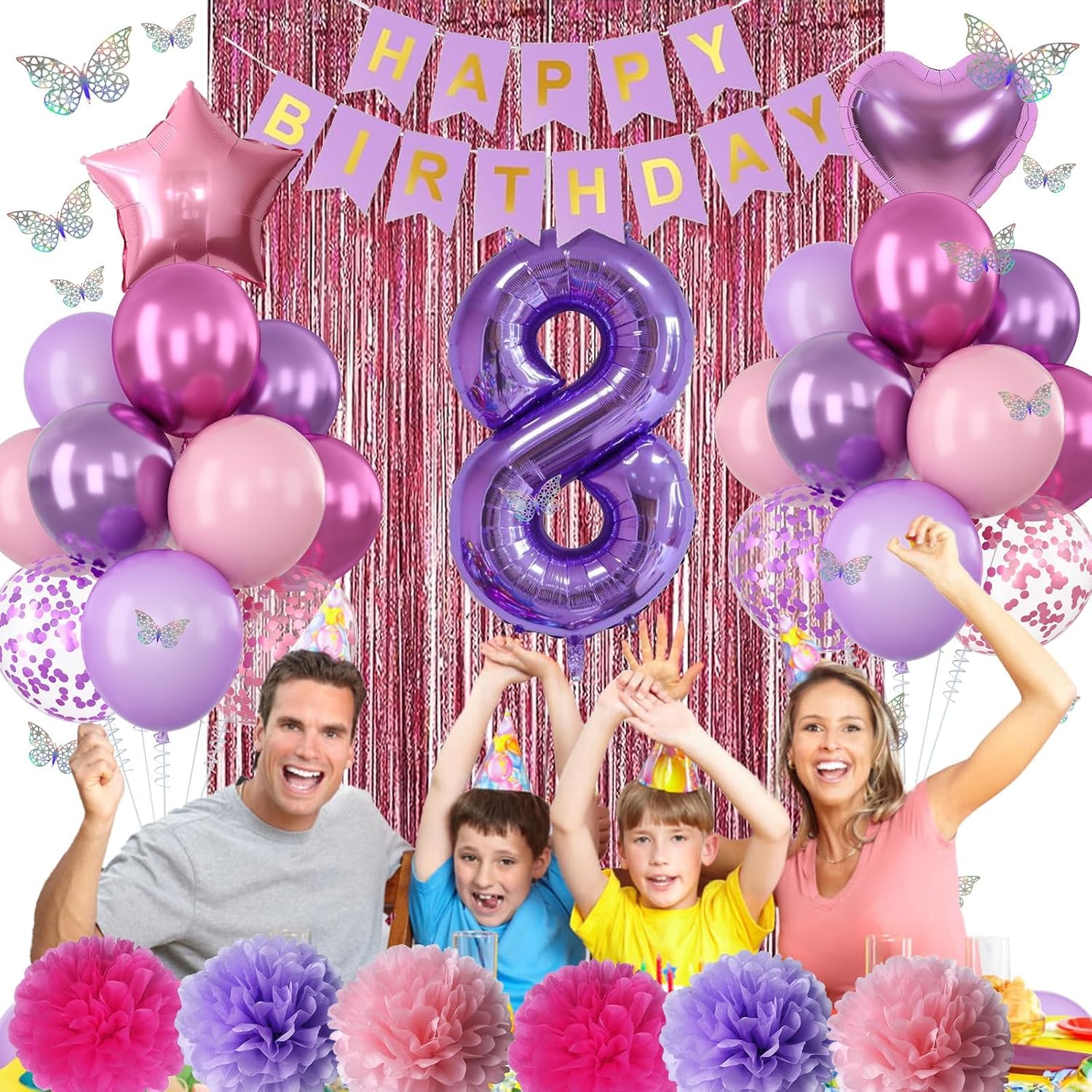• PACKAGE INCLUDES: 1pc purple number 8 balloon, 1pc happy birthday banner, 2pcs light pink paper pom poms, 2pcs light purple paper pom poms, 2pcs hot pink paper pom poms, 1pc light pink fringe curtain, 1pc light pink star foil balloons, 1pc light purple heart foil balloons, 6pcs pastel purple balloons, 6pcs pastel pink balloons, 4pcs metallic purple balloons, 4pcs metallic magenta balloons, 3pcs purple confetti ballons, 3pcs pink confetti ballons, 1pc butterfly stickers set, 1pc ribbon