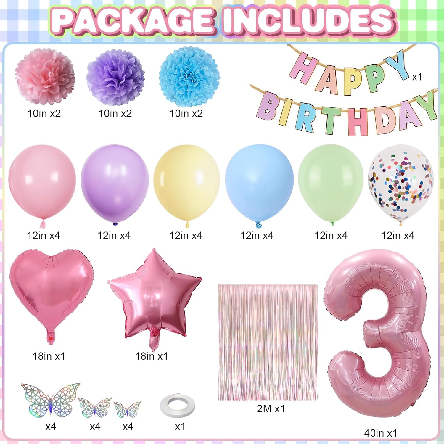 • PACKAGE INCLUDES: 1pc pearl pink number 3 balloon, 1pc happy birthday banner, 2pcs light pink paper pom poms, 2pcs light purple paper pom poms, 2pcs light blue paper pom poms, 1pc colorful white curtain, 1pc light pink star foil balloons, 1pc light pink heart foil balloons, 4pcs pastel purple balloons, 4pcs pastel pink balloons, 4pcs pastel blue balloons, 4pcs pastel green balloons, 4pcs pastel yellow balloons, 4pcs colorful confetti balloons, 1pc butterfly stickers set, 1pc ribbon