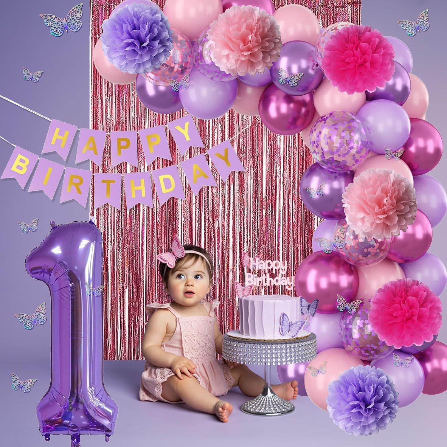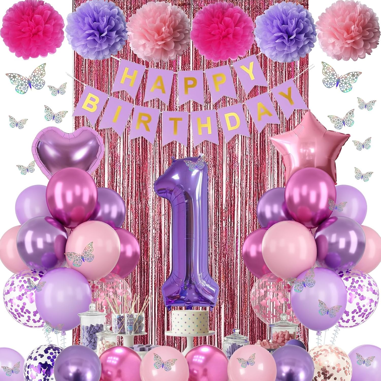 • PACKAGE INCLUDESο»Ώ: 1pc purple number 1 balloon, 1pc happy birthday banner, 2pcs light pink paper pom poms, 2pcs light purple paper pom poms, 2pcs hot pink paper pom poms, 1pc light pink fringe curtain, 1pc light pink star foil balloons, 1pc light purple heart foil balloons, 6pcs pastel purple balloons, 6pcs pastel pink balloons, 4pcs metallic purple balloons, 4pcs metallic magenta balloons, 3pcs purple confetti ballons, 3pcs pink confetti ballons, 1pc butterfly stickers set, 1pc ribbon