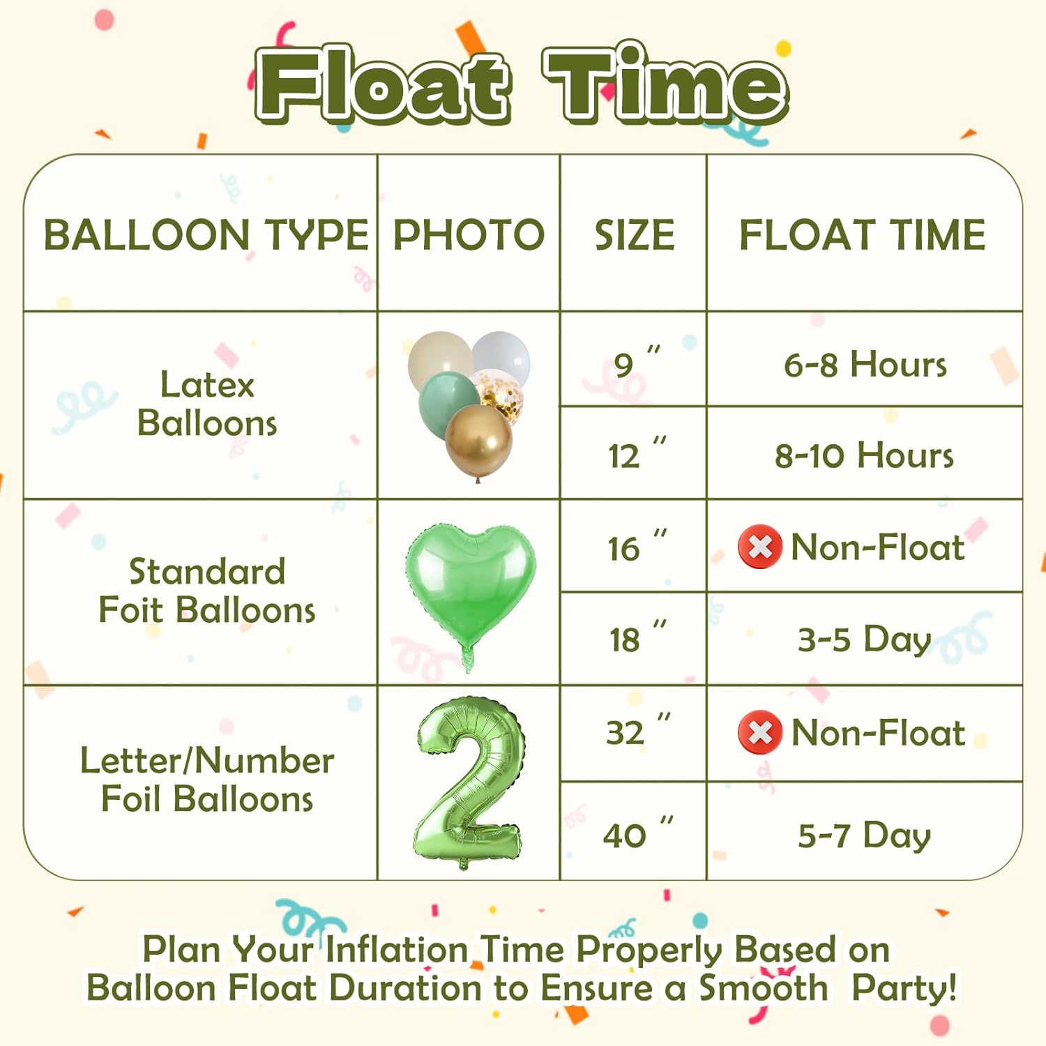 • Avocado Green Latex Balloons Set: 50 Pieces,12-inch (Uninflated - Inflate to 9 inches),2.8g per balloon.14pcs avocado green balloons, 14pcs beige balloons, 8pcs sand white balloons, 7pcs metallic gold balloons, 7pcs gold confetti balloons.