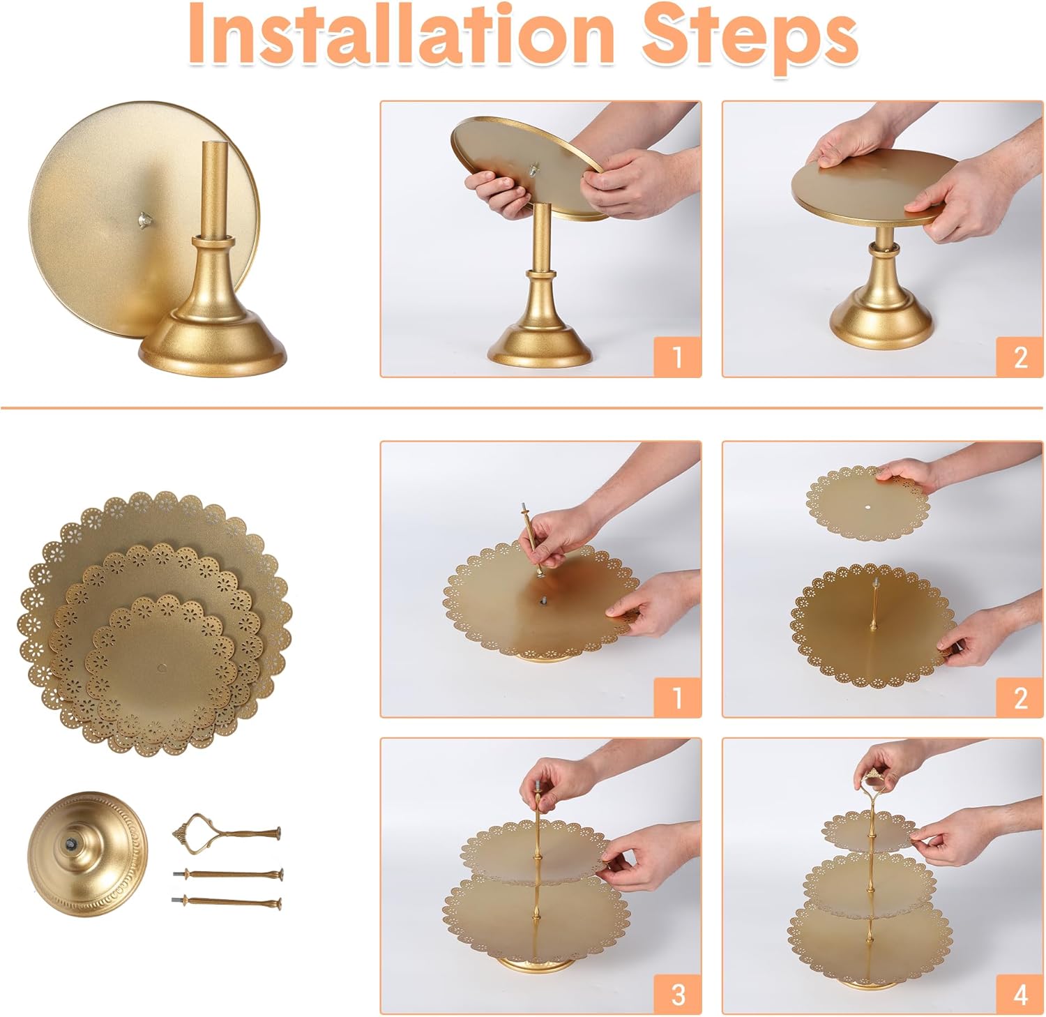 • Effortless to Assemble & Clean: No extra tools needed! Simply attach the base to each plate for fast assembly. Disassemble quickly after use for easy, thorough cleaning. Wipe the gold cake stand set with a damp towel to keep it sparkling, and easily store them for your next event