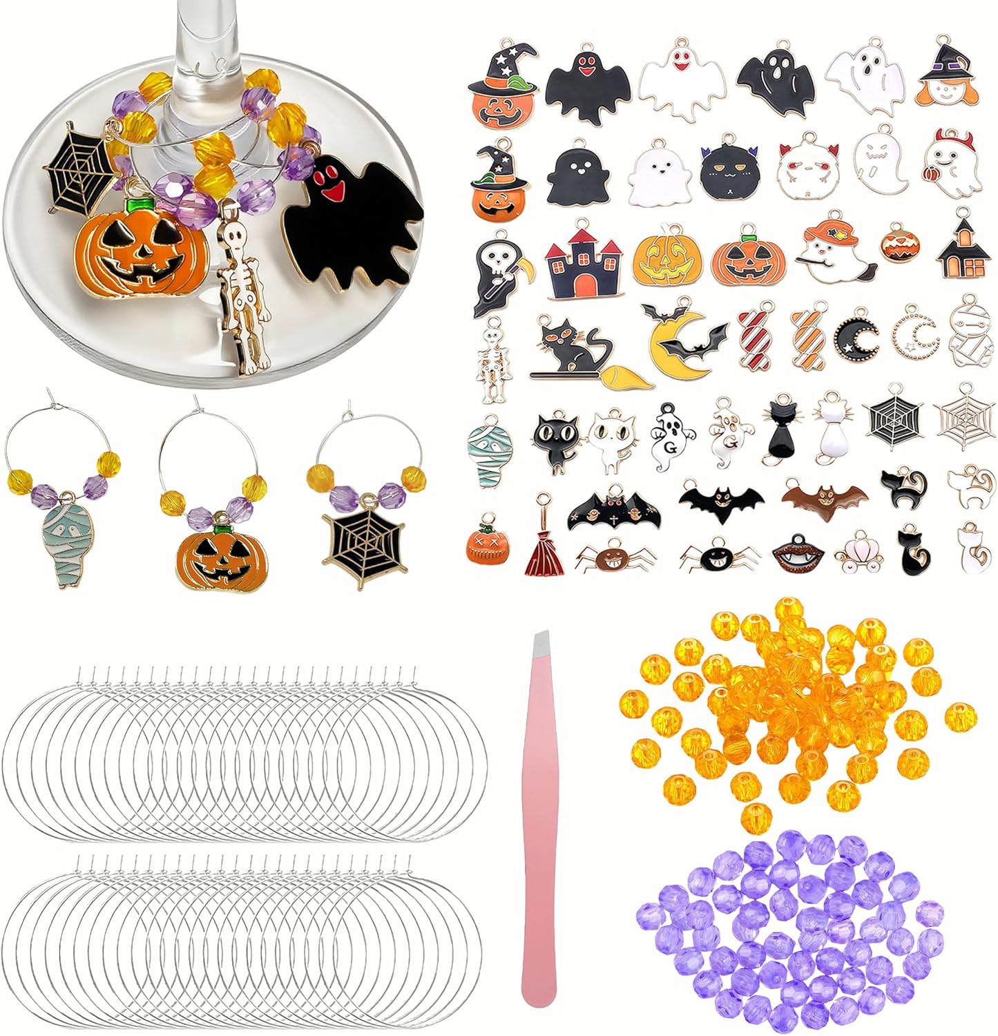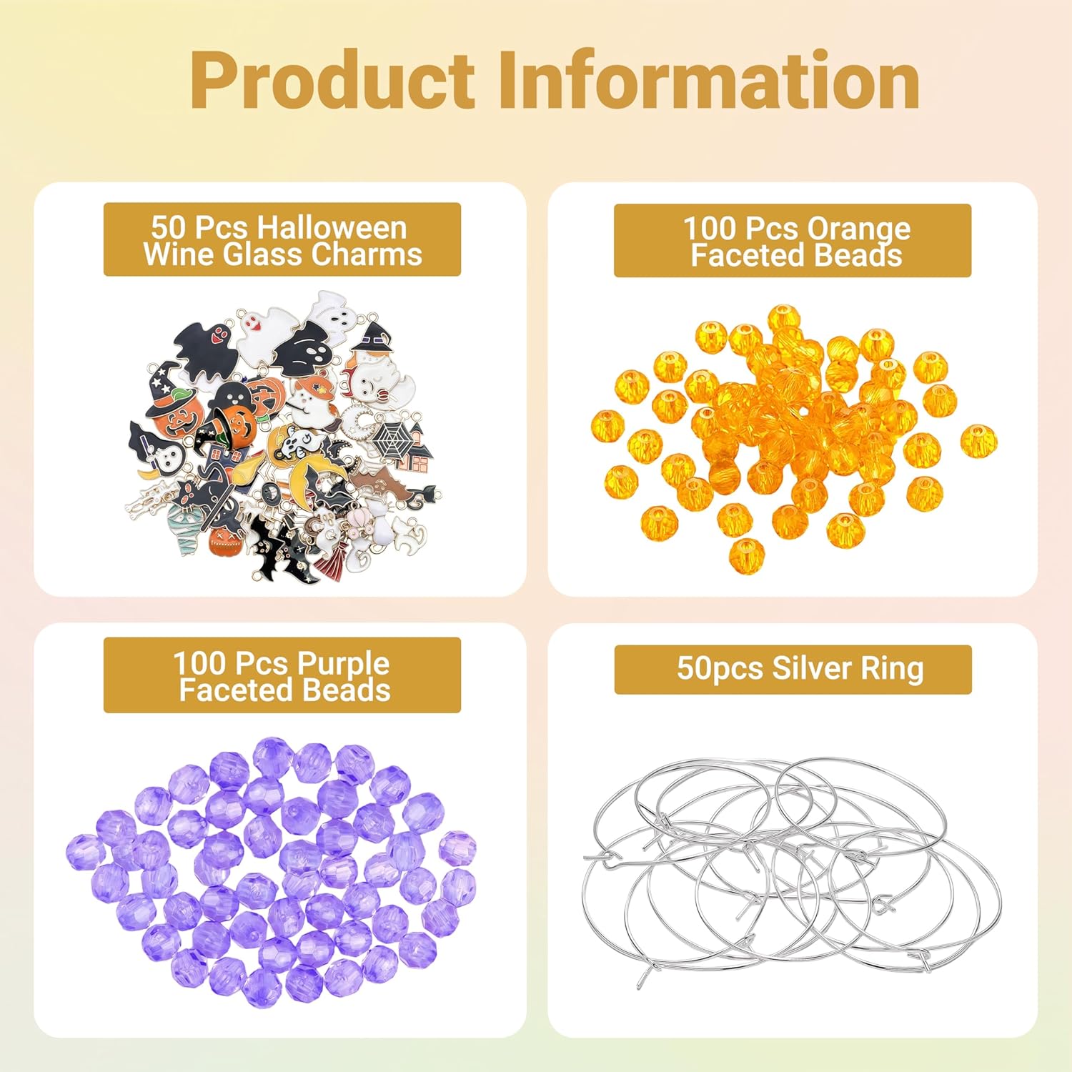 • HALLOWEEN WINE GLASS CHARMS KIT: Host the ultimate haunted party with this all-in-one DIY set! You'll receive 50 silver-toned wine charm rings, 50 unique Halloween alloy charms, 100 pumpkin-orange faceted beads, and 100 mystical-purple faceted beads. This massive kit ensures every guest can easily identify their glass, adding a fun, interactive element to your spooky celebration.