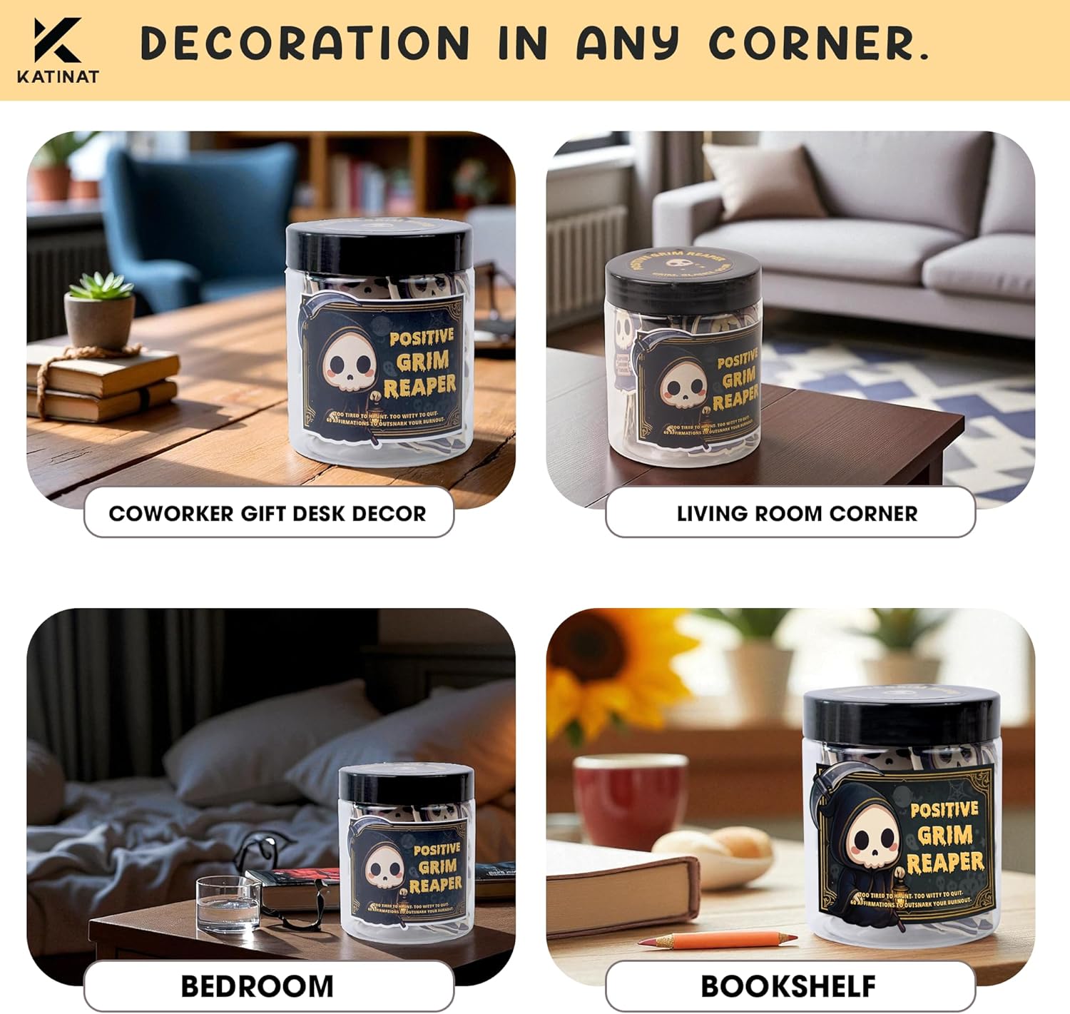• πŸ’€ Positive Grim Reaper Jar – Emotional Support Grim Reaper: A chillingly fun addition to halloween basket stuffers and unforgettable centerpiece in any halloween gift basket.