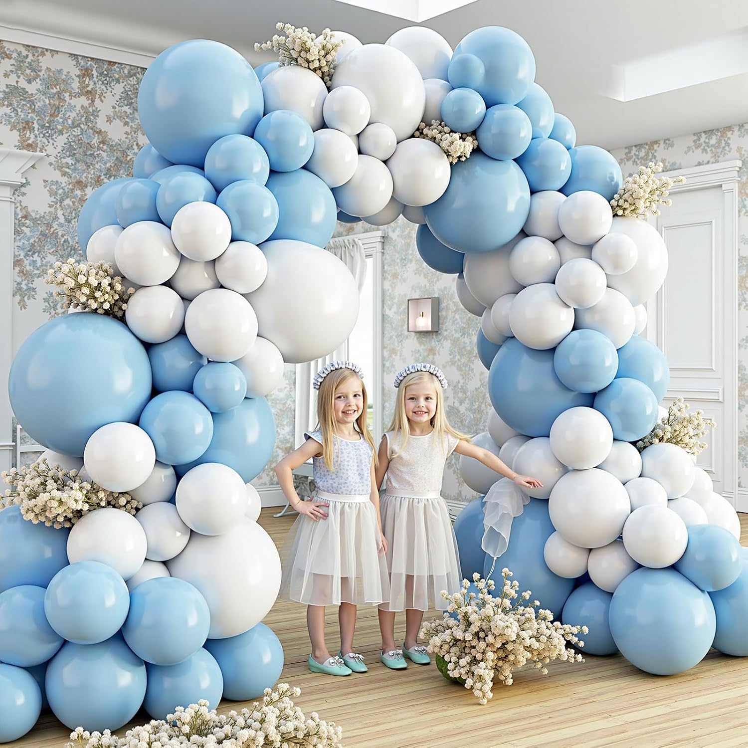 • Package List :blue and white balloon arch kit,includes 18" Light Blue /White Balloons (12 pcs), 12" Light Blue /White Balloons (100 pcs), 10" Light Blue /White Balloons (100 pcs), 5" Light Blue /White Balloons (100pcs),glue dotsx200, ribbonx2, decorative stripx2. plenty in quantity