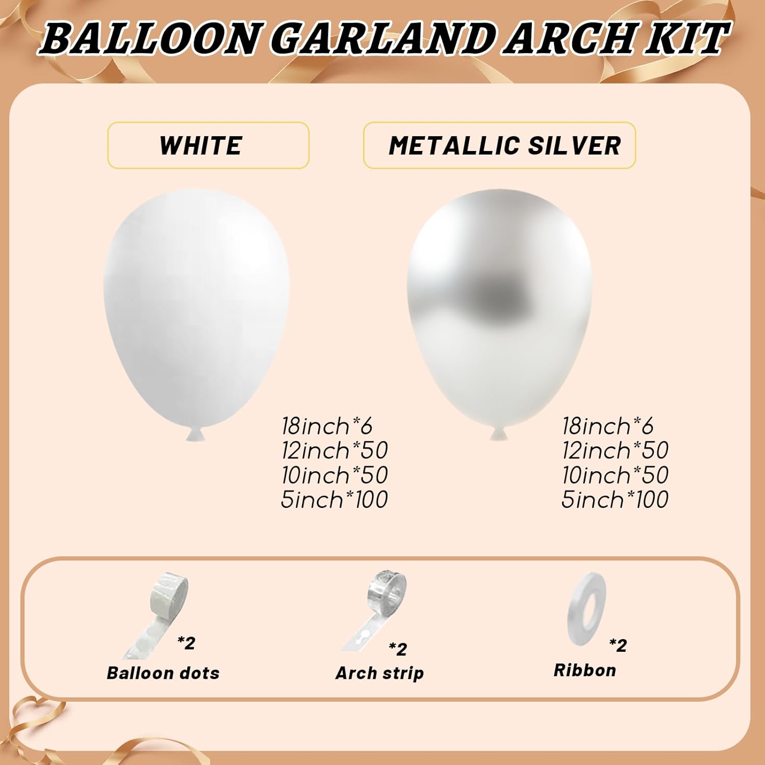 • Package List : white and silver balloon garland kit includes 18" White/Metallic silver balloons(12 pcs), 12" White/Metallic silver balloons(100 pcs), 10"White/Metallic silver balloons(100 pcs), 5" White/Metallic silver balloons(100pcs),glue dotsx200, ribbonx2, decorative stripx2. plenty in quantity.