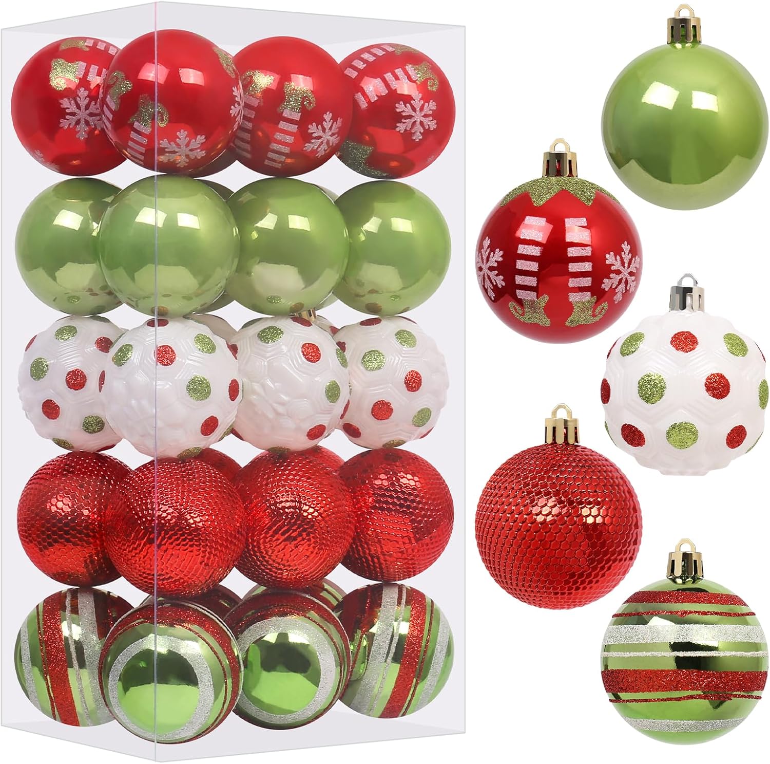 RoseCraft 30PCS Christmas Ornaments Set, 60MM/2.36" Red Green White Christmas Balls, Shatterproof Plastic Xmas Decorations for Christmas Tree Hanging Holiday Party Decor.